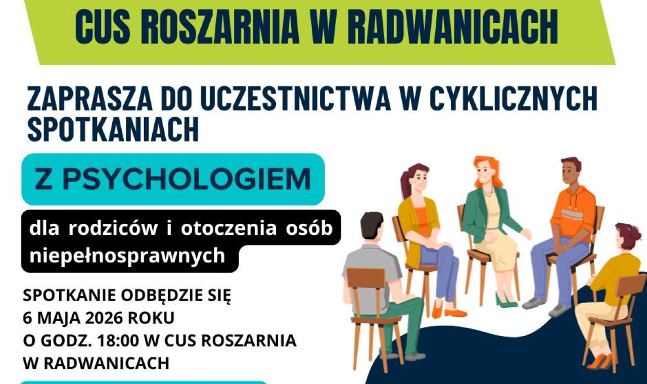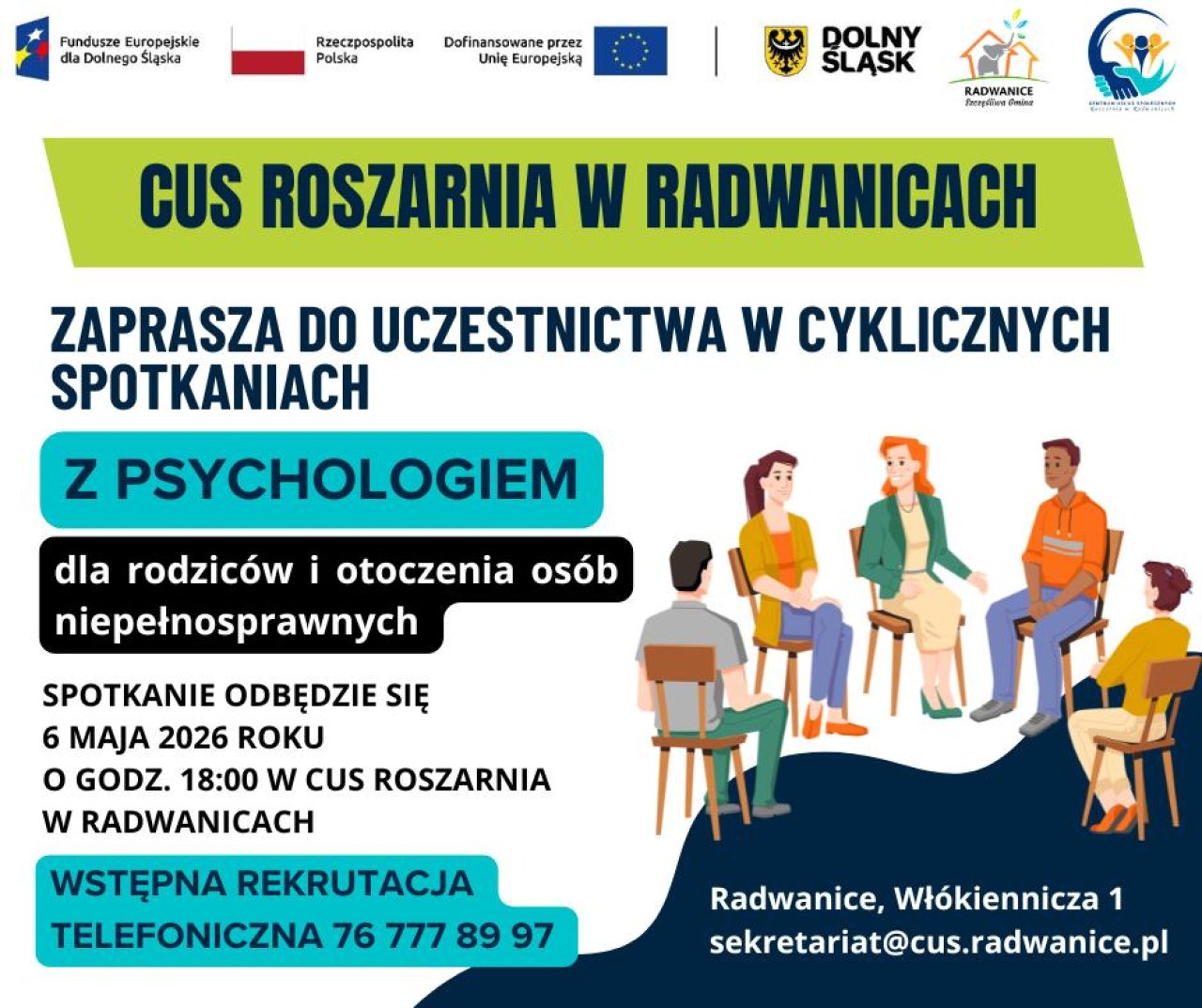 28-04-2026 12:28 Ruszają cykliczne grupowe spotkania z psychologiem w CUS Roszarnia w Radwanicach Dyrektor Centrum Usług Społecznych Roszarnia w Radwanicach zaprasza do udziału! Ruszają cykliczne grupowe spotkania z psychologiem w CUS Roszarnia w Radwanicach skierowane przede wszystkim do rodziców oraz otoczenia osób z niepełnosprawnościami. Spotkania będą odbywać się regularnie – raz w miesiącu, w każdą pierwszą środę miesiąca o godz. 18:00. Pierwsze spotkanie: 6 maja 2026 r. Godzina: 18:00 Miejsce: CUS Roszarnia w Radwanicach To przestrzeń do rozmowy, wsparcia oraz wymiany doświadczeń w życzliwej i bezpiecznej atmosferze Ważne informacje: • udział wymaga złożenia wniosku • obowiązuje wstępna rekrutacja telefoniczna Zapisy: 76 777 89 97 Zapraszamy serdecznie do udziału! ________________________________________ Projekt finansowany w ramach „Tworzenie i rozwój CUS w Radwanicach” współfinansowanego przez Unię Europejską ze środków Europejskiego Funduszu Społecznego Plus w ramach Programu Fundusze Europejskie dla Dolnego Śląska 2021-2027, Priorytet nr 7 „Fundusze Europejskie na rzecz rynku pracy i włączenia społecznego na Dolnym Śląsku”, Działania nr 7.7 „Rozwój usług społecznych i zdrowotnych”. #FunduszeUE #CUSRadwanice #Warsztaty #RozwójLokalny #UsługiSpołeczne #Radwanice