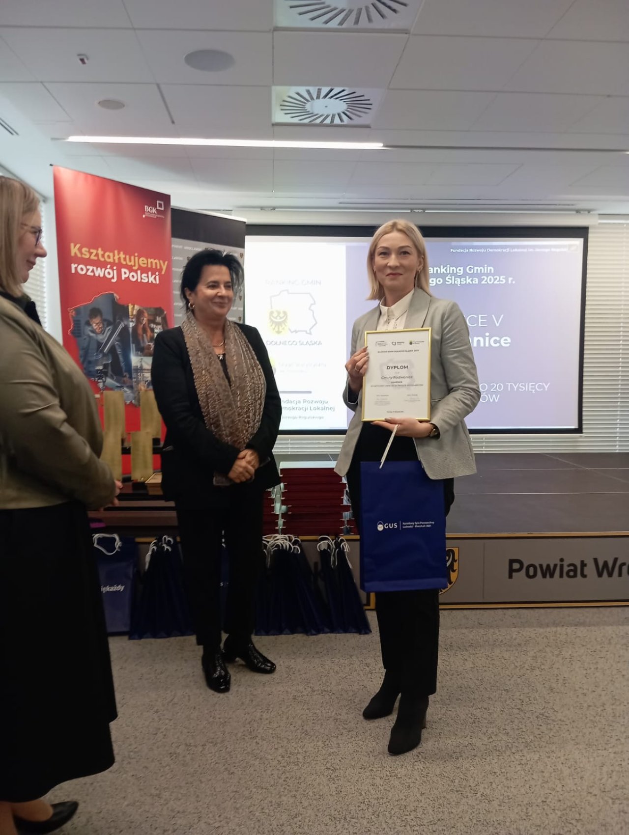 01-12-2025 12:17 Gmina Radwanice ponownie wśród najlepszych! 5. miejsce w Rankingu Gmin Dolnego Śląska 2025 Miło nam Państwa poinformować, że Gmina Radwanice uzyskała kolejne prestiżowe wyróżnienie, zajmując 5. miejsce w kategorii gmin do 20 tys. mieszkańców w Rankingu Gmin Dolnego Śląska 2025. Zestawienie, przygotowywane przez Fundację Rozwoju Demokracji Lokalnej im. Jerzego Regulskiego we współpracy z Urzędem Statystycznym we Wrocławiu, od lat należy do najbardziej wiarygodnych rankingów samorządowych w regionie. Ocena gmin opierała się na 25 wskaźnikach obejmujących rozwój ekonomiczny, społeczny, środowiskowy oraz jakość zarządzania. Tak wysokie miejsce gminy Radwanice świadczy o stabilnym rozwoju, skutecznym wykorzystaniu potencjału oraz rosnącej jakości życia mieszkańców. Wyróżnienie to potwierdza, że gmina konsekwentnie podąża w dobrym kierunku, łącząc nowe inwestycje, troskę o mieszkańców i odpowiedzialne zarządzanie. Wyróżnienie w imieniu Wójta Gminy Radwanice odebrała Pani Małgorzata Stroka- Zastępca Wójta Gminy, pełniąca również funkcję Sekretarza Gminy Radwanice.