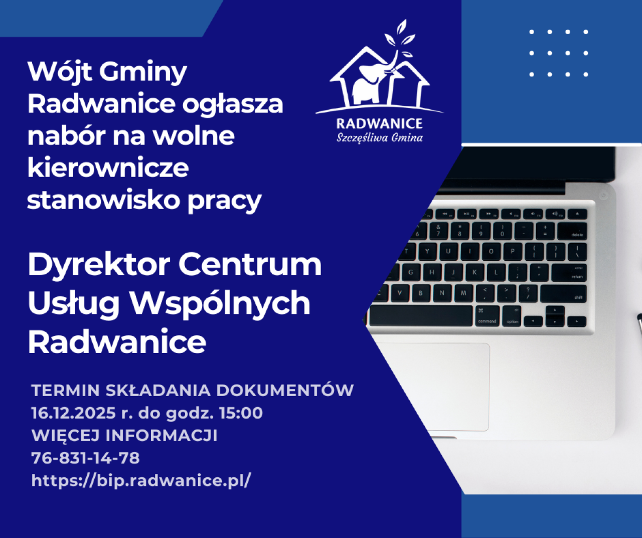 04-12-2025 07:03 Wójt Gminy Radwanice ogłasza nabór na wolne kierownicze stanowisko pracy Wójt Gminy Radwanice ogłasza nabór na wolne kierownicze stanowisko pracy. Więcej informacji na stronie: OGŁOSZENIE
