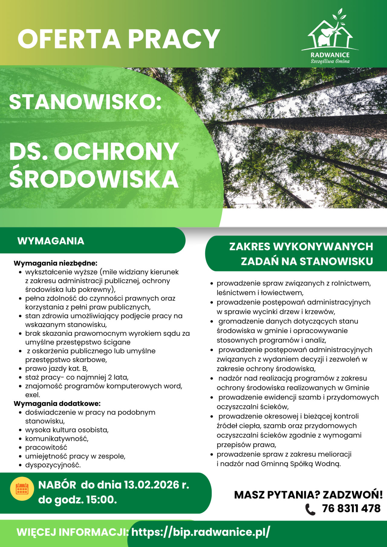03-02-2026 12:47 Wójt Gminy Radwanice Ogłasza Nabór na Wolne Stanowisko Pracy ds. Ochrony Środowiska Wójt Gminy Radwanice OGŁASZA NABÓR NA WOLNE STANOWISKO PRACY ds. ochrony środowiska. Wszystkie niezbędne informacje dotyczące ww. naboru znajdą Państwo pod następującym linkiem: https://bip.radwanice.pl/ogloszenie-o-naborze-na-wolne...