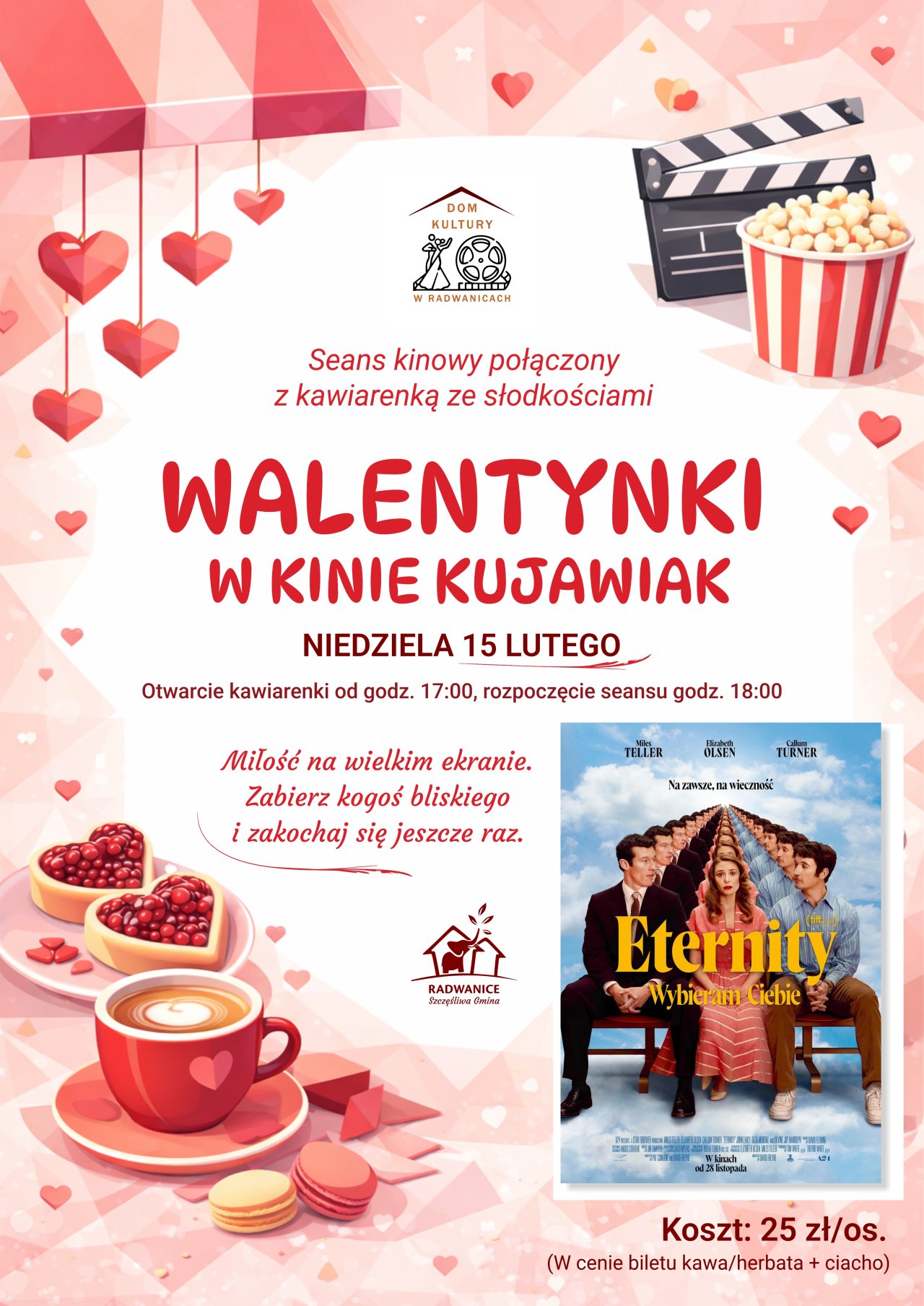 06-02-2026 10:13 Walentynki w Kinie Kujawiak – romantyczny seans w Domu Kultury w Radwanicach Dom Kultury w Radwanicach zaprasza na wyjątkowe Walentynki w Kinie Kujawiak, które odbędą się w niedzielę 15 lutego. To propozycja dla wszystkich, którzy chcą spędzić ten dzień w miłej, kameralnej atmosferze – przy dobrym filmie, aromatycznej kawie i słodkim poczęstunku. Walentynkowy seans połączony będzie z kawiarenką ze słodkościami, co stworzy idealne warunki do wspólnego, spokojnego świętowania. Na dużym ekranie zostanie wyświetlony film „Eternity. Wybieram Ciebie” – romantyczna opowieść o miłości, wyborach i relacjach. Harmonogram wydarzenia: otwarcie kawiarenki: godz. 17:00 rozpoczęcie seansu: godz. 18:00 Koszt udziału: 25 zł od osoby (w cenie biletu kawa lub herbata oraz ciasto) Walentynkowy seans w Kinie Kujawiak to doskonała okazja, aby spędzić czas z bliską osobą, przyjaciółmi lub po prostu zrobić sobie przyjemny wieczór w wyjątkowej atmosferze. Organizatorzy serdecznie zapraszają wszystkich mieszkańców gminy i okolic. Jak Walentynki – to w Domu Kultury w Radwanicach. Więcej informacji tel: 76 8316 873