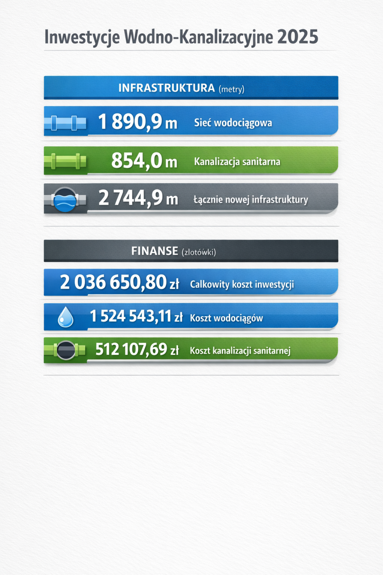 15-01-2026 07:31 2036650,80 zł brutto na sieć wodociągowo-kanalizacyjną Budowa i modernizacja sieci wodociągowych oraz kanalizacji sanitarnej to kluczowe zadanie dla rozwoju gminy. Zapewnia bezpieczeństwo zdrowotne mieszkańców, poprawia warunki życia, zwiększa atrakcyjność inwestycyjną i chroni środowisko naturalne. W roku 2025 w ramach gospodarki wodno – ściekowej zrealizowano inwestycje: 1. W ramach zadania pn.: „Zwiększenie dostępności do terenów inwestycyjnych na terenie Gminy Radwanice” finansowanego z Rządowego Funduszu Polski Ład, gmina wykonała przebudowę sieci wodociągowej wraz z budową przepompowni i zbiornikiem. Łączna wybudowana długość sieci wodociągowej wynosi 966,80 m. Pompownia wody to kontenerowym budynek o konstrukcji stalowej w którym pracują 4 pompy o mocy 4 kW każda. Przy pompowni powstał zbiornik wody pitnej o pojemności 23 m3. Wartość kosztorysowa robót: 1.129.478,25 zł brutto. 2. „Budowa sieci wodociągowej i kanalizacji sanitarnej w m. Radwanice, dz. nr 497, 238/5” – koło plebanii. W ramach inwestycji wybudowano sieć kanalizacji sanitarnej o średnicy fi 200 mm i długości 83,60 m. Wartość kosztorysowa robót budowy sieci kanalizacji sanitarnej: 55.568,50 zł brutto. Wybudowano również sieć wodociągową o średnicy fi 90 mm i długości 113,6 m. Wartość kosztorysowa robót: 42.831,50 zł brutto. 3. „Budowa sieci wodociągowej i kanalizacji sanitarnej w m. Radwanice, ul. Planetarna”, ul. Marsa i ul. Wenus – wybudowano sieć kanalizacji sanitarnej o średnicy fi 200 mm i długości 372,3 m. Wartość kosztorysowa robót sieci kanalizacji sanitarnej: 220.445,02 zł brutto. Sieć wodociągowa o średnicy fi 110 mm i długości 383,2 m - wartość kosztorysowa robót: 168.774,40 zł brutto. 4. „Budowa sieci wodociągowej i kanalizacji sanitarnej w m. Buczyna, ul. Słowiańska” - wybudowano sieć kanalizacji sanitarnej o średnicy fi 200 mm i długości 187,10 m oraz rurociąg tłoczny PE 100 o średnicy fi 63 mm o długości 34 m. Wartość kosztorysowa robót: 122.543,28 zł brutto. W ramach inwestycji wybudowano sieć wodociągową o średnicy fi 110 mm i długości 227,30 m. Wartość kosztorysowa robót: 75.486,73 zł brutto. 5. „Rozbudowa sieci wodociągowej i sieci kanalizacji sanitarnej w m. Radwance, ul. Cyprysowa i ul. Jałowcowa”. W ramach inwestycji wykonano sieć kanalizacji sanitarnej o średnicy fi 200 mm i długości 177 m. Wartość kosztorysowa robót: 113.550,89 zł brutto. Nowy odcinek sieci wodociągowej o średnicy fi 110 mm i długości 200 m. Wartość kosztorysowa robót: 107.972,23 zł brutto. Łączna kwota nakładów poniesionych na rozbudowę sieci wodociągowych i kanalizacji sanitarnej to 2.036.650,80 zł brutto (woda – 1.524.543,11 zł brutto, kanalizacja sanitarna – 512.107,69 zł brutto). Budowa sieci wodociągowej i kanalizacji sanitarnej zapewnia mieszkańcom stały dostęp do bezpiecznej wody pitnej oraz skuteczne odprowadzanie ścieków, co bezpośrednio poprawia warunki sanitarne i zdrowotne. Inwestycje te zwiększają również atrakcyjność terenów pod zabudowę, chronią środowisko naturalne przed zanieczyszczeniem i sprzyja zrównoważonemu rozwojowi gminy.