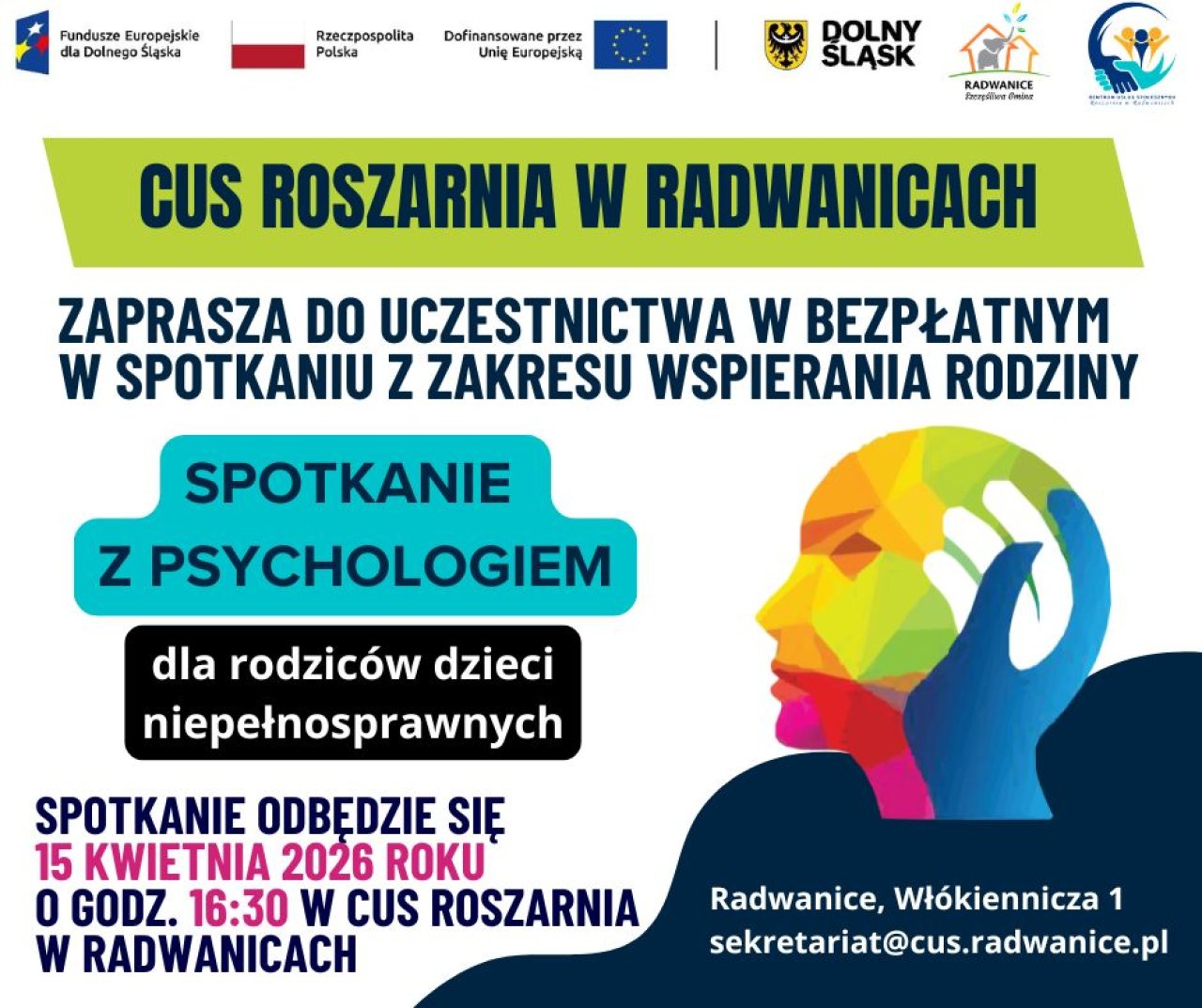 13-04-2026 09:44 Bezpłatne Spotkania z Psychologiem w CUS Serdecznie zapraszamy Państwa na spotkanie z psychologiem, które odbędzie się, dnia 15.04.2026r. (środa) w godzinach 16:30 – 17:30 w Centrum Usług Społecznych Roszarnia w Radwanicach. Spotkanie z psychologiem jest dedykowane rodzicom dzieci niepełnosprawnych i będzie okazją do: • omówienia trudności emocjonalnych , z jakimi Państwo i Państwa dzieci spotykacie się na co dzień • uzyskania wsparcia psychologicznego i wskazówek dotyczących pracy z dzieckiem w domu i w szkole • wymiany doświadczeń z innymi rodzicami w podobnej sytuacji, • zadawania pytań dotyczących rozwoju emocjonalnego, społecznego i edukacyjnego dzieci. Chcemy, aby to spotkanie było przestrzenią otwartej rozmowy, wsparcia i wzajemnego zrozumienia. Psycholog odpowie na Państwa pytania i udzieli wskazówek dostosowanych do indywidualnych potrzeb każdego dziecka. Będą otwarte zapisy na indywidualne i bezpłatne spotkania z psychologiem w ramach projektu i działań CUS. Udział w spotkaniu jest całkowicie bezpłatny.