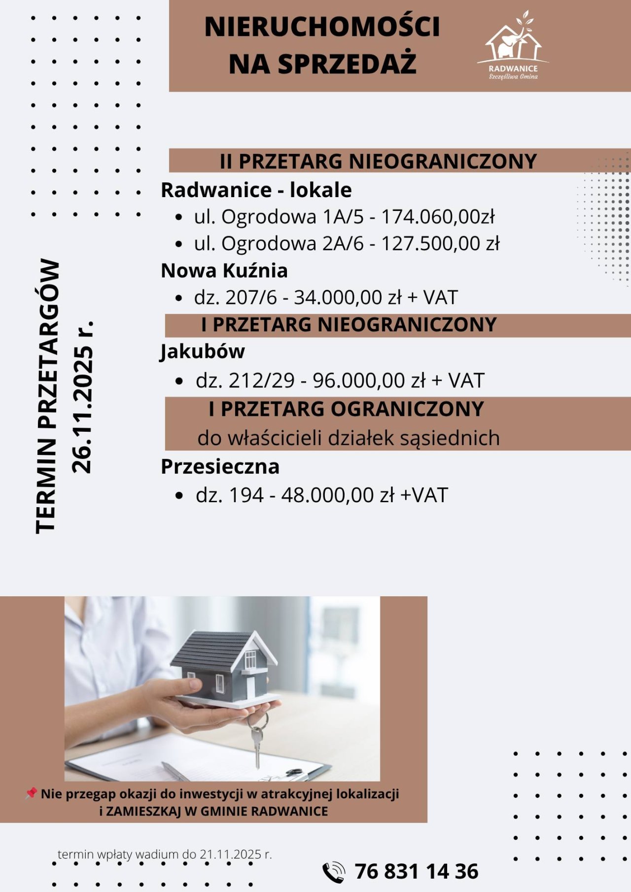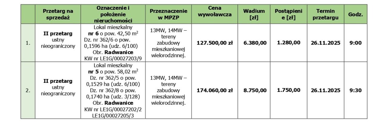 15-11-2025 02:27 Gmina Radwanice kontynuuje sprzedaż lokali mieszkalnych oraz działek W ostatnim postępowaniu przetargowym Gmina Radwanice sprzedała dwa lokale mieszkalne z budynków wielorodzinnych przy ul. Ogrodowej 3B/3 i Ogrodowej 2/7. Na dzień dzisiejszy pozostały nam jeszcze do sprzedaży dwa lokale, które wciąż są przeznaczone do sprzedaży w przetargu nieograniczonym Na sprzedaż są jeszcze działki w Nowej Kuźni, Radwanicach, Jakubowie i Przesiecznej.