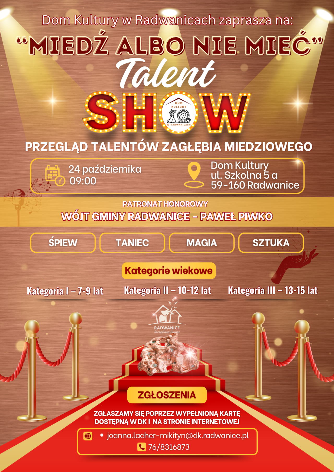 03-10-2025 10:43 II Przegląd Talentów Zagłębia Miedziowego „Miedź albo nie mieć” II Przegląd Talentów Zagłębia Miedziowego „Miedź albo nie mieć” Radwanice ponownie staną się miejscem, gdzie młodzi artyści z całego Zagłębia Miedziowego pokażą swoje pasje i niezwykłe zdolności. Już 24 października 2025 r. o godz. 9:00 w sali widowiskowej Domu Kultury w Radwanicach odbędzie się II Przegląd Talentów „Miedź albo nie mieć”. To wydarzenie skierowane jest do dzieci i młodzieży w wieku od 7 do 15 lat, które chcą spróbować swoich sił na scenie i zaprezentować to, co kochają najbardziej – śpiew, taniec, recytację, iluzję czy teatr jednego aktora. Organizatorzy podkreślają, że nie liczy się tylko wygrana, ale przede wszystkim odwaga, pasja i dobra zabawa. Kategorie wiekowe i nagrody Uczestnicy zmierzą się w trzech grupach wiekowych: 7–9 lat, 10–12 lat, 13–15 lat. Na najlepszych czekają atrakcyjne nagrody za miejsca na podium, a dodatkowo przyznana zostanie nagroda publiczności, która sprawi, że każdy występ będzie miał szansę zdobyć serca widzów. Jak się zgłosić? Aby wziąć udział w konkursie, należy wypełnić kartę zgłoszenia i dostarczyć ją do 18 października 2025 r.. O kolejności występów zdecyduje kolejność zgłoszeń. Szczegółowe zasady udziału dostępne są w regulaminie konkursu II Przegląd Talentów to wyjątkowa okazja, aby młodzi mieszkańcy Zagłębia Miedziowego mogli podzielić się swoimi umiejętnościami, poczuć magię sceny i zainspirować innych. Jeśli masz pasję i chcesz ją pokazać światu – to wydarzenie jest właśnie dla Ciebie! 🌟 KARTA ZGŁOSZENIA, REGULAMIN