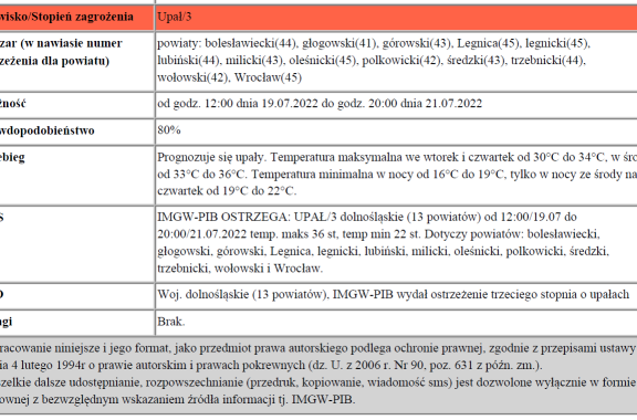 18-07-2022 01:21 IMGW ostrzega przed upałami IMGW wydało dla naszego powiatu ostrzeżenie 3 stopnia przed upałami. Temperatury dla naszego regionu mogą osiągać maksymalną temperaturę 36 stopni Celsjusza. Alert jest ogłoszony od dziś tj. 18 lipca od godziny 12.00 do 21 lipca br.