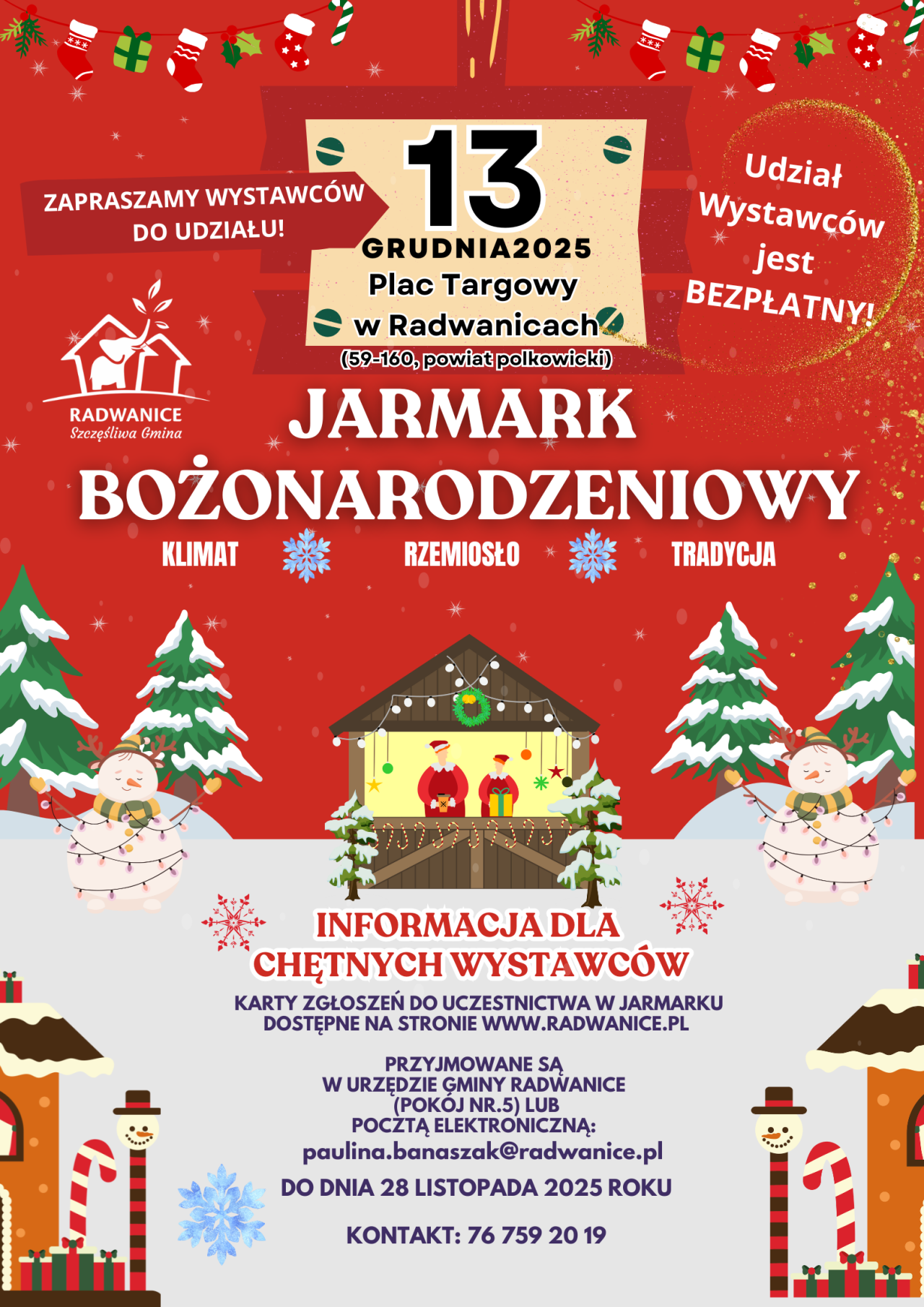 21-10-2025 12:41 Zaproszenie dla wystawców – Jarmark Bożonarodzeniowy w Radwanicach Gmina Radwanice serdecznie zaprasza wystawców do udziału w Jarmarku Bożonarodzeniowym, który odbędzie się 13 grudnia 2025 roku na Placu Targowym w Radwanicach (59-160, powiat polkowicki). To niezwykłe wydarzenie co roku przyciąga tłumy mieszkańców, lokalnych twórców, rzemieślników i pasjonatów świątecznych tradycji. Jarmark Bożonarodzeniowy w Radwanicach to prawdziwa uczta dla zmysłów — zapach pierników, blask światełek i dźwięki kolęd tworzą niepowtarzalną atmosferę, której nie da się porównać z żadną inną. To właśnie tutaj spotykają się ludzie z pasją — ci, którzy z serca tworzą swoje wyroby: unikatowe rękodzieło, pachnące wypieki, naturalne miody, ozdoby i dekoracje, które mają duszę. Każdy wystawca wnosi coś wyjątkowego, a razem budujemy miejsce pełne ciepła, serdeczności i prawdziwej magii Świąt Bożego Narodzenia. 🎄 Dodatkowo, w tym roku przygotowaliśmy bogaty program artystyczny, który przyciągnie wielu mieszkańców i gości z całego regionu — koncerty, występy dzieci i młodzieży, konkursy, animacje oraz świąteczne atrakcje dla najmłodszych. To oznacza jedno: duży ruch, mnóstwo odwiedzających i doskonałą okazję, by dobrze sprzedać swoje wyroby oraz zyskać nowych klientów! Jeśli chcesz, by Twoje stoisko stało się częścią tego wyjątkowego, tętniącego życiem wydarzenia — nie czekaj! Przyjedź do Radwanic i razem z nami stwórz Jarmark, o którym długo będzie się mówiło — pełen radości, zapachu cynamonu i prawdziwego ducha Świąt. ❤️ Udział wystawców jest bezpłatny! Zapraszamy do udziału: twórców rękodzieła, lokalnych producentów żywności, koła gospodyń wiejskich, szkoły, stowarzyszenia i organizacje społeczne, wszystkich, którzy chcą zaprezentować swoje wyroby i włączyć się w świąteczne świętowanie. Jak się zgłosić? Wypełnione zgłoszenia należy przesłać: 📍 osobiście lub pocztą do Urzędu Gminy Radwanice (pokój nr 5),ul.Przemysłowa 17,59-160 Radwanice 📧 lub drogą elektroniczną na adres: paulina.banaszak@radwanice.pl Klimat – Rzemiosło – Tradycja Dołącz do grona wystawców i współtwórz z nami wyjątkowy Jarmark Bożonarodzeniowy w Radwanicach! Niech to wydarzenie stanie się miejscem spotkań, inspiracji i świątecznej radości dla całej naszej społeczności. MASZ PYTANIA? ZAPRASZAMY DO KONTAKTU: 76 759 20 19 KARTA ZGŁOSZENIA REGULAMIN