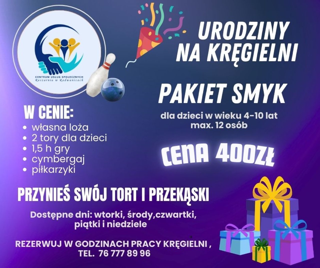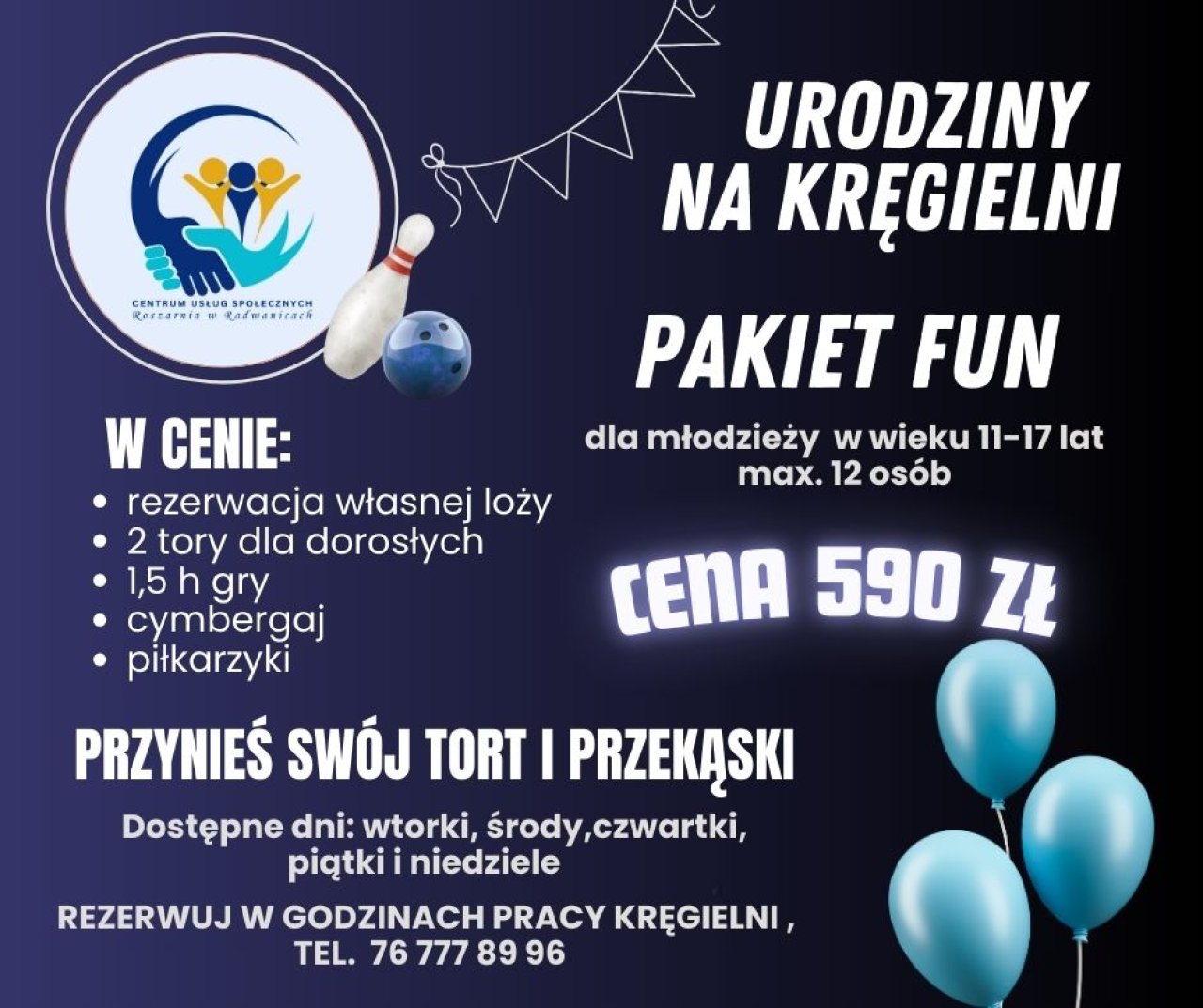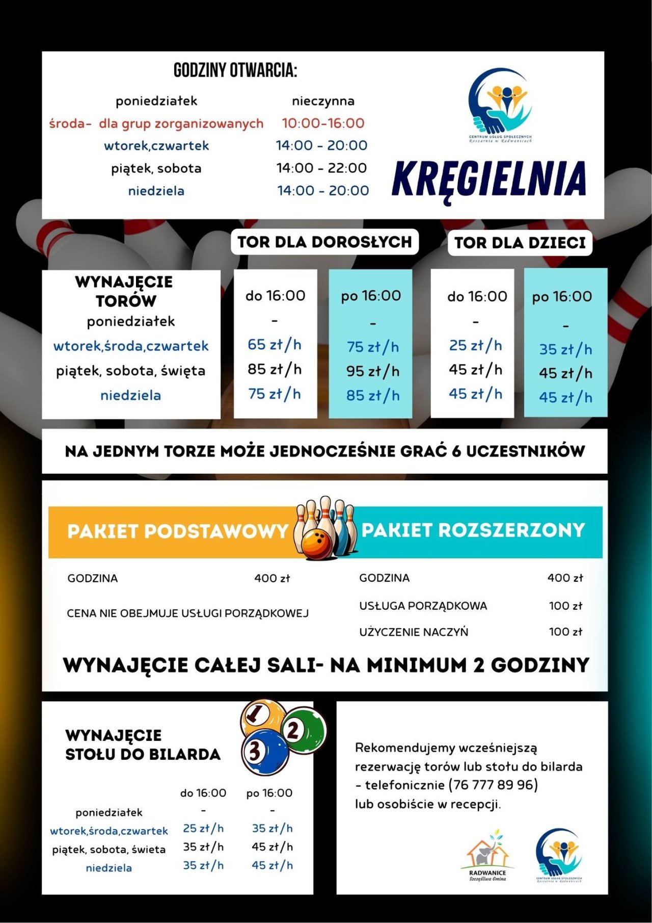10-03-2026 10:53 Spędź swój czas na Kręgielni w Radwanicach! Startujemy z kręgielnią w CUS Roszarnia w Radwanicach! Mamy świetną wiadomość dla wszystkich miłośników kręgli – od środy 11 marca 2026 roku rusza kręgielnia w CUS Roszarnia w Radwanicach! Środy są dedykowane dla grup zorganizowanych, dlatego obowiązują w tym dniu specjalne godziny otwarcia: 10:00–16:00 To świetna okazja na wspólną zabawę, integrację i trochę sportowej rywalizacji! Zbierz swoją grupę i wpadnijcie sprawdzić tor. Standardowe godziny otwarcia kręgielni: poniedziałek – nieczynna środa – 10:00-16:00 wtorek, czwartek – 14:00–20:00 piątek, sobota – 14:00–22:00 niedziela – 14:00–20:00 Zachęcamy do wcześniejszej rezerwacji torów lub stołu do bilarda: 76 777 89 96 lub bezpośrednio w recepcji.
