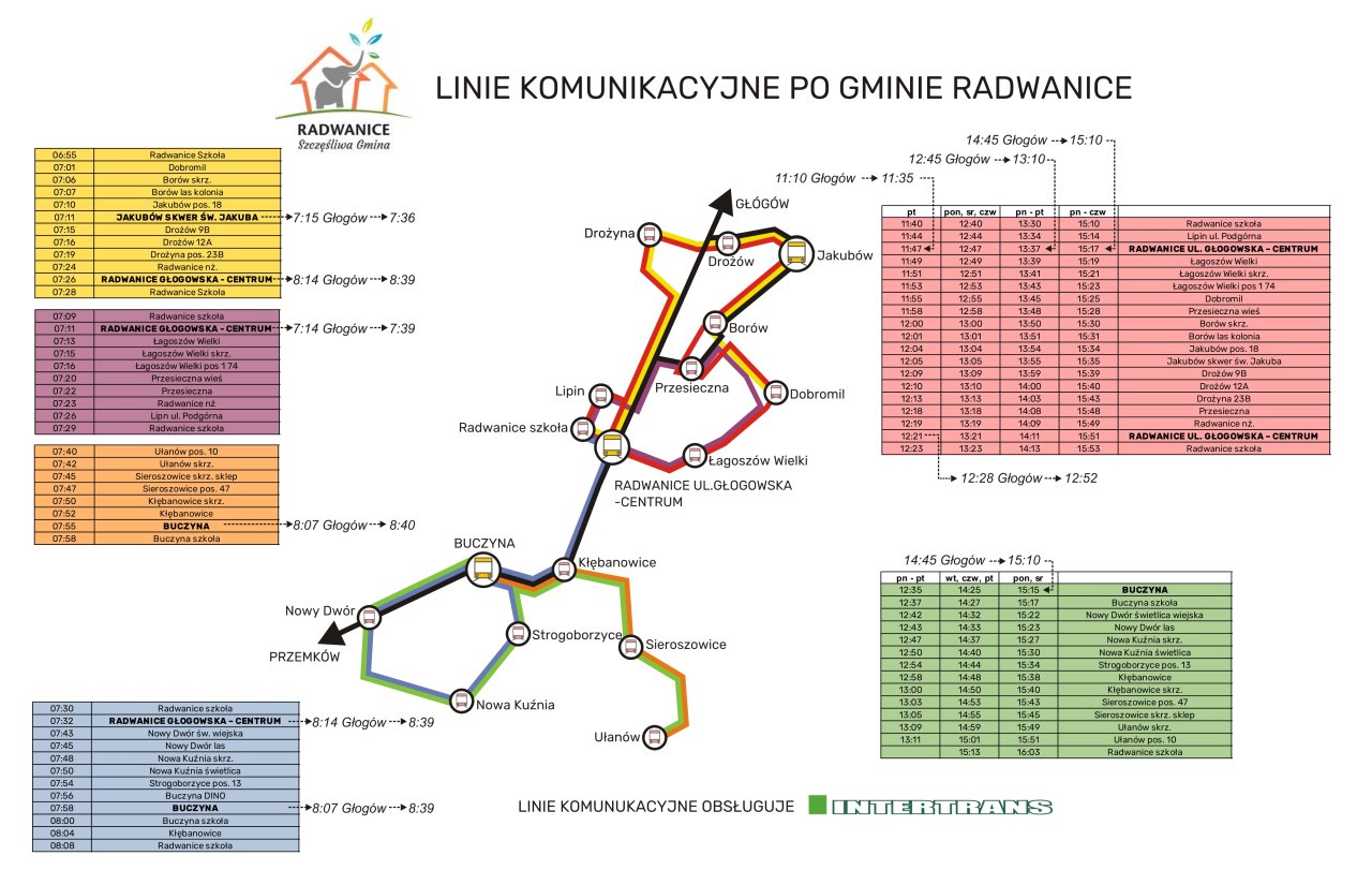 09-10-2025 12:41 Nowa możliwość dla mieszkańców Gminy Radwanice-przewozy gminne Mieszkańcy wsi należących do gminy Radwanice zyskali nową, bardzo wygodną formę przemieszczania się pomiędzy miejscowościami. Od teraz z autobusów gminnych mogą korzystać również dorośli mieszkańcy – nie tylko uczniowie! To doskonałe rozwiązanie dla osób, które potrzebują dostać się z jednej wsi do drugiej, odwiedzić urząd, zrobić zakupy czy załatwić codzienne sprawy. Co ważne, koszt przejazdu nie przekracza 3 zł . Dzięki temu mieszkańcy mogą na przykład z Buczyny dojechać do Radwanic, a stamtąd kontynuować podróż do Głogowa. To duże ułatwienie zwłaszcza dla osób starszych, młodzieży oraz tych, którzy nie dysponują własnym środkiem transportu. Usługę realizuje przewoźnik Intertrans PKS Głogów, a aktualny rozkład jazdy dostępny jest poniżej. Nowe rozwiązanie to kolejny krok w stronę poprawy dostępności komunikacyjnej gminy Radwanice i wsparcia jej mieszkańców w codziennym funkcjonowaniu.