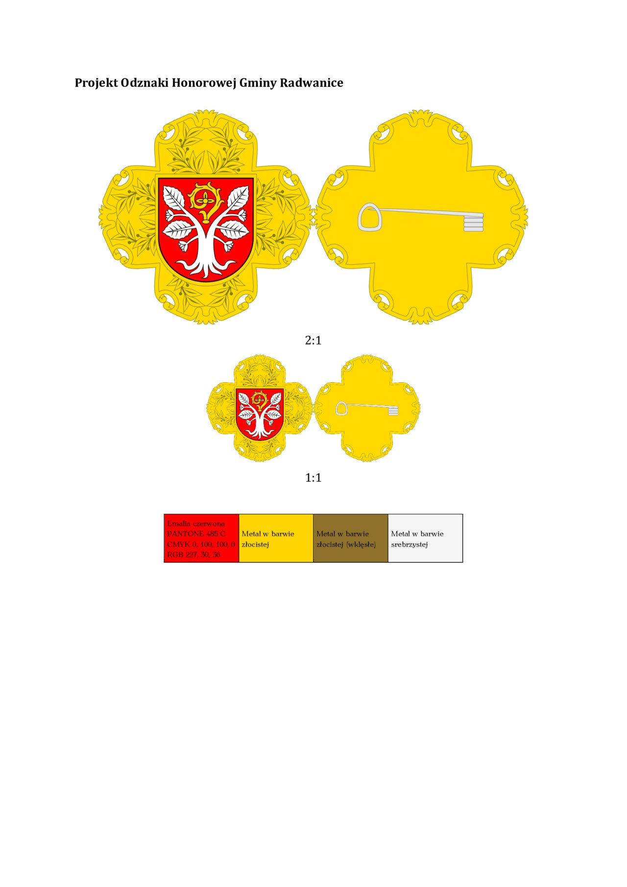 13-06-2024 10:47 ODZNAKA HONOROWA GMINY RADWANICE Odznaka nadawana jest osobom, które całokształtem swej działalności zawodowej lub społecznej przyczyniły się do gospodarczego, oświatowego, kulturalnego lub społecznego rozwoju gminy Radwanice oraz jej promocji na zewnątrz. Odznaka Honorowa Gminy Radwanice wykonana jest z metalu w barwie złocistej i ma formę krzyża równoramiennego o długości ramion 36 mm, z lekko rozszerzającymi sią ramionami, których zewnętrzne krawędzie wywinięte są w 4 rulony - dwa boczne do góry i do środka, dwa środkowe do dołu i na boki, pomiędzy środkowymi rulonami pięciolistny motyw roślinny, całość z podwójnie zaznaczoną krawędzią zewnętrzną, po stronie licowej ramiona krzyża wypełnione wieńcami laurowymi ułożonymi zgodnie z kierunkami ramion, na to nałożony barwny (emalia) herb gminy według ustalonego wzoru, obramowany cienką złotą bordiurą. Strona odwrotna gładka, z krawędzią zaznaczoną linią podwójną i przypięciem agrafkowym. Odznaka nadawana jest osobom, które całokształtem swej działalności zawodowej lub społecznej przyczyniły się do gospodarczego, oświatowego, kulturalnego lub społecznego rozwoju gminy Radwanice oraz jej promocji na zewnątrz.