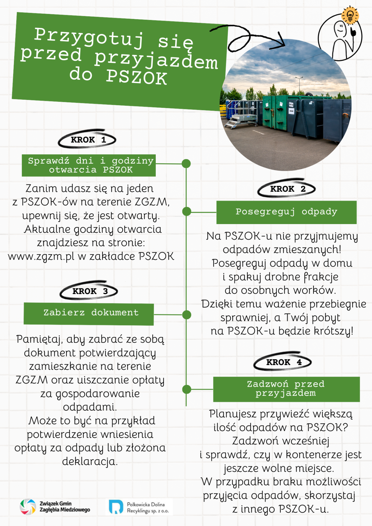 03-10-2025 09:14 Przygotuj się przed przyjazdem do PSZOK Planujesz dostarczyć odpady do Punktu Selektywnego Zbierania Odpadów Komunalnych (PSZOK)? Aby Twoja wizyta przebiegła sprawnie i bezproblemowo, warto wcześniej się przygotować. Dzięki kilku prostym krokom zaoszczędzisz czas i unikniesz niepotrzebnych komplikacji. Przygotuj się przed przyjazdem do PSZOK ♻️ Planujesz dostarczyć odpady do Punktu Selektywnego Zbierania Odpadów Komunalnych (PSZOK)? Aby Twoja wizyta przebiegła sprawnie i bezproblemowo, warto wcześniej się przygotować. Dzięki kilku prostym krokom zaoszczędzisz czas i unikniesz niepotrzebnych komplikacji. Krok 1. Sprawdź dni i godziny otwarcia Zanim wybierzesz się do jednego z PSZOK-ów na terenie Związku Gmin Zagłębia Miedziowego (ZGZM), upewnij się, że punkt jest czynny. Aktualne godziny otwarcia znajdziesz na stronie 👉 www.zgzm.pl Krok 2. Posegreguj odpady Na PSZOK-u nie są przyjmowane odpady zmieszane. Dlatego ważne jest, aby już w domu posegregować odpady i spakować drobne frakcje do osobnych worków lub pojemników. Dzięki temu ważenie przebiegnie szybciej, a cała wizyta w punkcie zajmie mniej czasu. Krok 3. Zabierz dokument Pamiętaj, aby mieć ze sobą dokument potwierdzający zamieszkanie na terenie ZGZM oraz uiszczanie opłaty za gospodarowanie odpadami. Może to być np. potwierdzenie wniesienia opłaty lub złożona deklaracja. Bez tego pracownicy PSZOK mogą odmówić przyjęcia odpadów. Krok 4. Zadzwoń przed przyjazdem Jeśli planujesz przywieźć większą ilość odpadów, warto wcześniej zadzwonić i upewnić się, czy w kontenerach jest jeszcze wolne miejsce. W przypadku braku możliwości przyjęcia odpadów w danym punkcie, możesz skorzystać z innego PSZOK-u. Dbajmy razem o porządek i środowisko 🌍💚 Przygotowanie się do wizyty w PSZOK to drobny wysiłek, który ułatwia pracę obsłudze punktu i sprawia, że proces odbioru odpadów przebiega szybciej i sprawniej. Dzięki temu możemy skuteczniej dbać o czystość naszej gminy i wspierać recykling. ℹ️ Szczegółowe informacje oraz godziny otwarcia PSZOK znajdziesz tutaj: 👉 www.zgzm.pl
