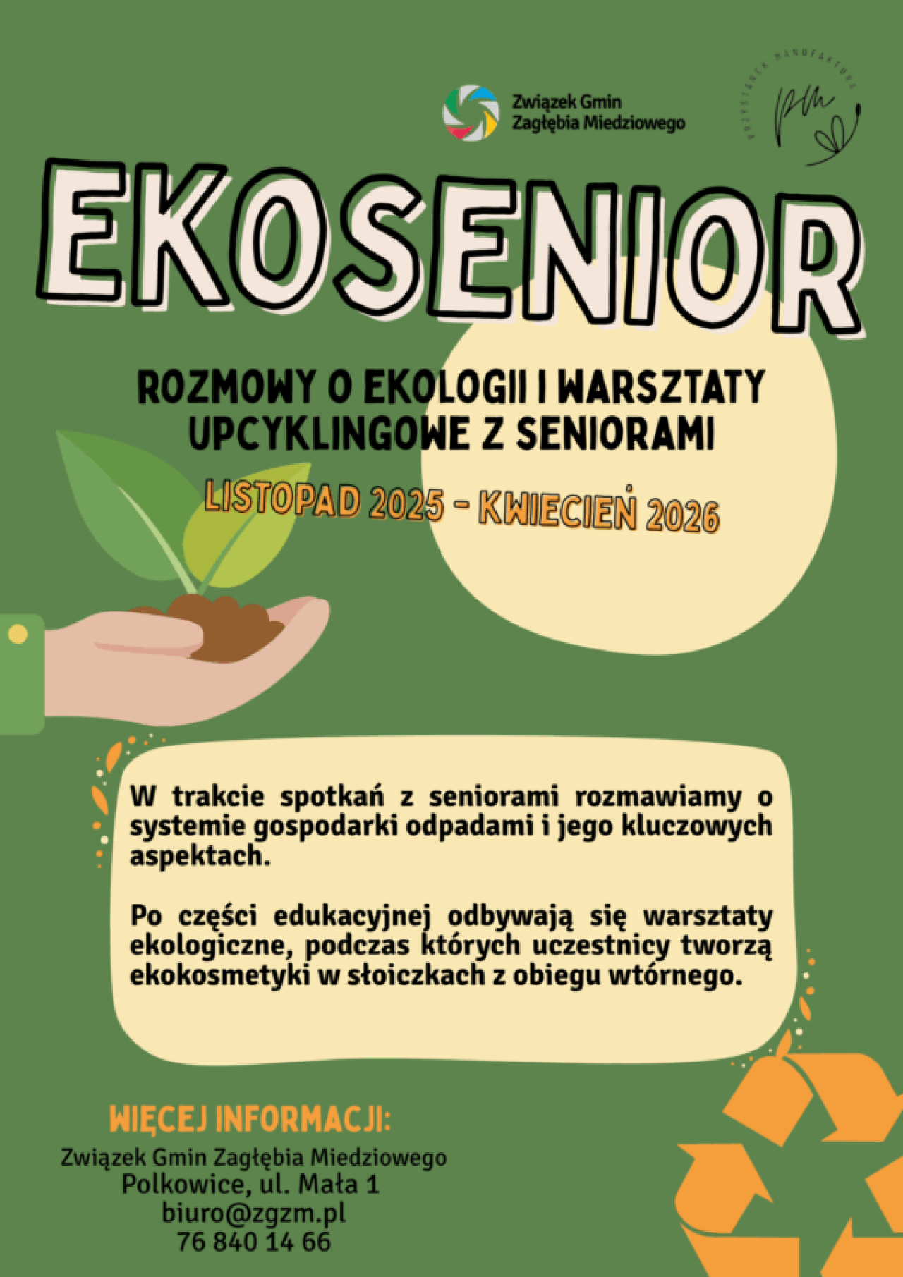 08-10-2025 08:49 Rusza akcja „EkoSenior” – edukacja ekologiczna dla seniorów z terenu ZGZM Związek Gmin Zagłębia Miedziowego rozpoczyna wyjątkowy projekt skierowany do seniorów – EkoSenior. To połączenie edukacji ekologicznej i kreatywnych warsztatów upcyklingowych, które mają na celu podniesienie świadomości ekologicznej i promowanie idei gospodarki o obiegu zamkniętym wśród starszych mieszkańców naszych gmin. W ramach projektu odwiedzimy kluby i stowarzyszenia senioralne działające na terenie ZGZM, gdzie odbędą się trzygodzinne spotkania składające się z dwóch części: Prezentacja edukacyjna prowadzona przez pracownika ZGZM, podczas której uczestnicy poznają: zasady działania systemu gospodarki odpadami, sposoby prawidłowej segregacji odpadów, informacje o PSZOK-ach i odpadach niebezpiecznych, ilości odpadów wytwarzanych w regionie oraz praktyczne ekoporady. Warsztaty rękodzielnicze prowadzone przez Agnieszkę Kopeć z firmy Przystanek Manufaktura, podczas których uczestnicy nauczą się tworzyć naturalne kosmetyki wykorzystując słoiki z recyklingu. To świetny sposób na ponowne wykorzystanie materiałów i promocję ekologicznych nawyków w codziennym życiu. Spotkania będą organizowane od listopada 2025 roku do kwietnia 2026 roku. Konkretne terminy będą ustalane indywidualnie z koordynatorami grup senioralnych z co najmniej dwutygodniowym wyprzedzeniem. Regulamin