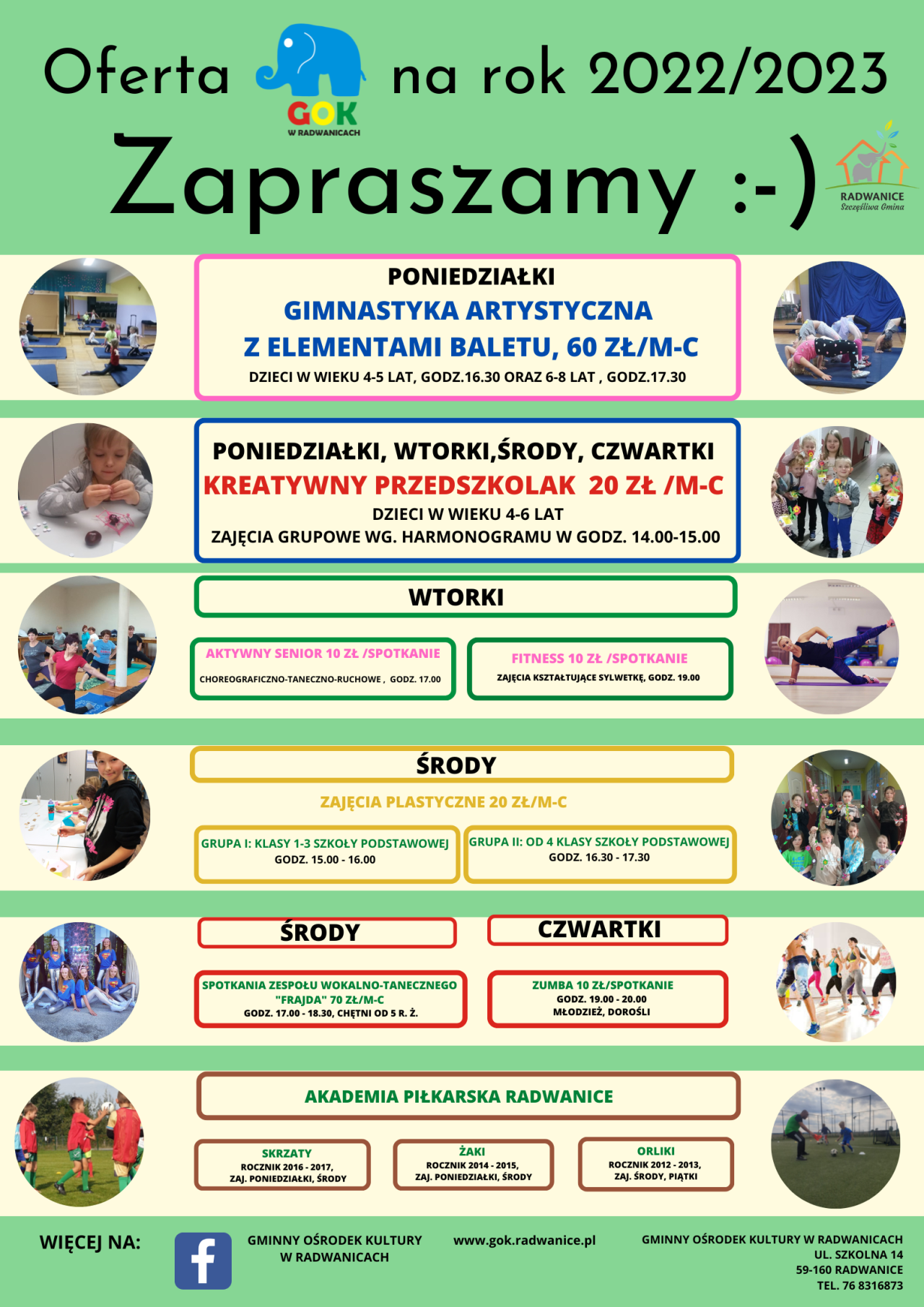 22-09-2022 09:10 Zajęcia Dodatkowe w GOKu. Zachęcamy Do Zapisów W GOKu w Radwanicach trwają zapisy na zajęcia dodatkowe. W ofercie między innymi gminastyka artystyczna, zajęcia dla przedszkolaków, zajęcia taneczne i plastyczne. Dzieci na pewno spędzą na zajęciach fantastycznie czas, rozwijając przy tym swoje zainteresowania i pobudzając kreatywność. Nie zabrakło oferty dla seniorów i osób dorosłych. Zajęcia taneczno ruchowe, modelujące sylwetkę i zumba na pewno pomogą Państwu na chwilkę oderwać się od codziennych obowiązków! Serdecznie zapraszamy do zapisów 76 8316 873