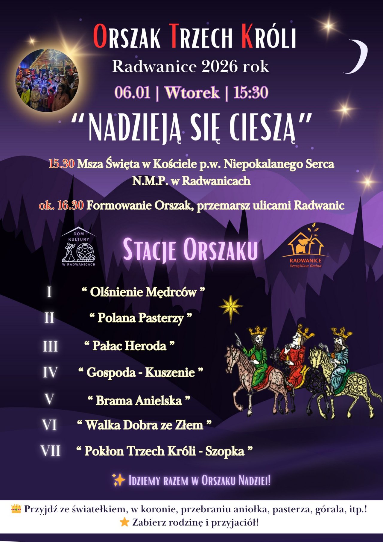 05-01-2026 08:42 Już we wtorek Orszak Trzech Króli! ORSZAK TRZECH KRÓLI W RADWANICACH 6 stycznia 2026 roku, godz. 15.30 Orszak Trzech Króli 2026 „Nadzieją się cieszą!” Przebierz się i dołącz! Stroje i światełka mile widziane – dzieci i dorośli Zabierz rodzinę i przyjaciół! Wyrusz z nami w Orszaku Nadziei! Niech nas połączy radość, wspólne kolędowanie i droga za Gwiazdą do Betlejem Do zobaczenia!
