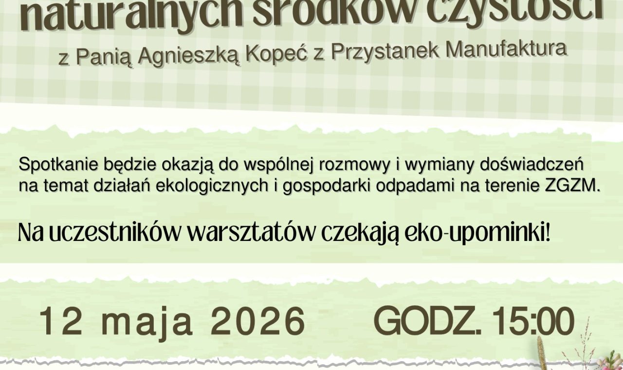13-04-2026 09:25 W OBIEGU – Warsztaty ekologiczne dla dorosłych Chcesz zadbać o swój dom w sposób naturalny i przyjazny dla środowiska? A może szukasz prostych, ekologicznych rozwiązań na co dzień? Zapraszamy na wyjątkowe warsztaty, podczas których odkryjesz świat naturalnych środków czystości! 12 maja godz. 15:00 obowiązują zapisy- regulamin dostępny na stronie Domu Kultury w Radwanicach. Podczas spotkania: poznasz skuteczne i bezpieczne alternatywy dla chemii domowej dowiesz się, jak samodzielnie przygotować ekologiczne środki czystości zdobędziesz praktyczne wskazówki, które od razu wykorzystasz w domu Warsztaty poprowadzi Anna Kopeć z Przystanek Manufaktura– pasjonatka naturalnych rozwiązań i świadomego stylu życia Związek Gmin Zagłębia Miedziowego Organizatorem wydarzenia jest Zrób coś dobrego dla siebie i dla planety – dołącz do nas!