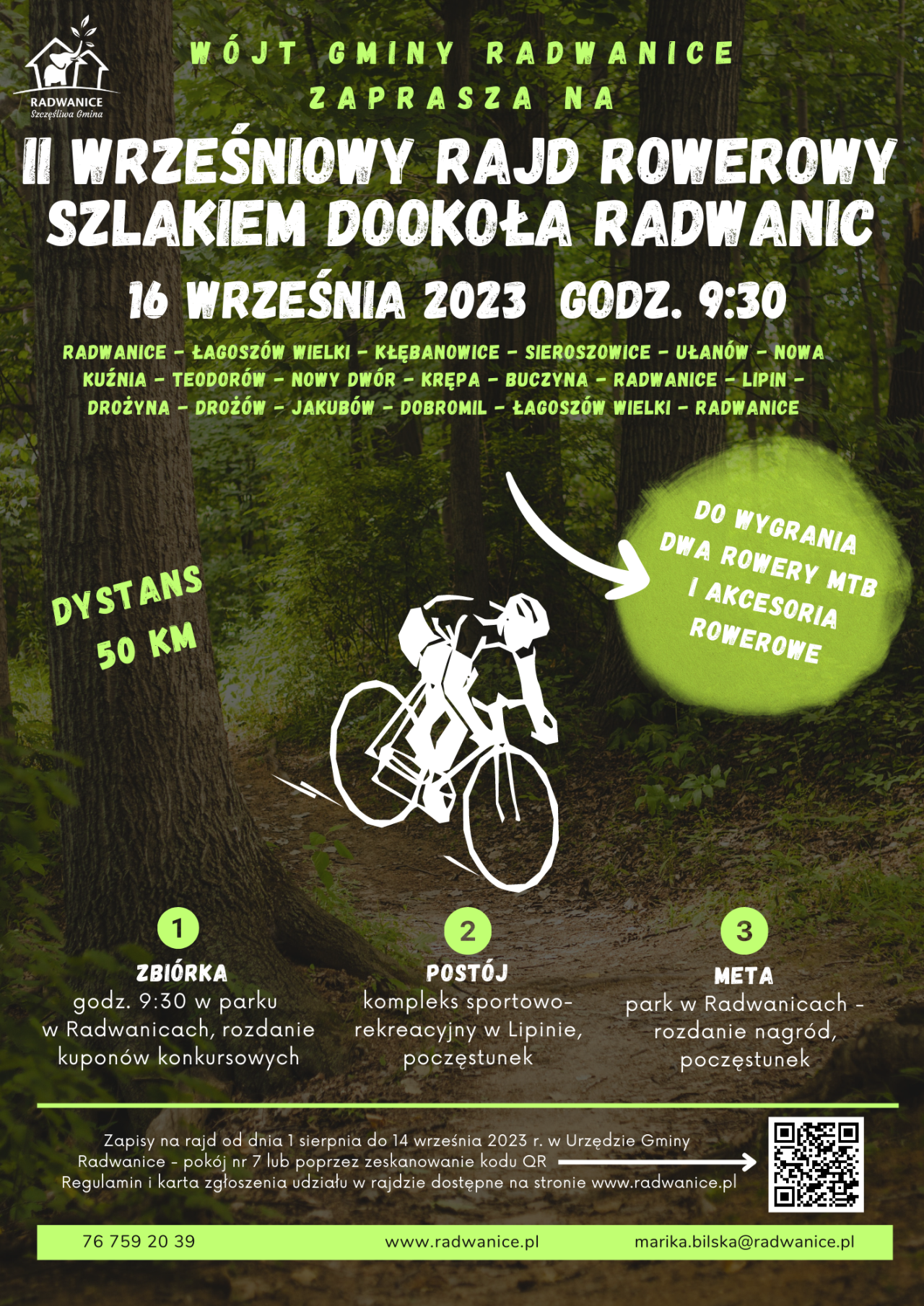 13-09-2023 06:45 Zapisy na Wrześniowy Rajd Rowerowy Rajd Rowerowy Szlakiem Dookoła Radwanic już 16 września! Zapisy odbywają się poprzez formularz internetowy dostępny tutaj: https://forms.office.com/r/qwrZCvhDLG lub poprzez wypełnienie Karty Zgłoszeniowej i dostarczenie jej do Urzędu Gminy (pokój numer 7) Więcej informacji udziela Pani Marika Bilska, tel: 76 759 20 39 Regulamin Karta Zgłoszenia Uwaga!! Rajd jest bezpłatny dla wszystkich uczestników bez względu na miejsce zamieszkania! Do wygrania atrakcyjne gadżety rowerowe i dwa rowery MTB!