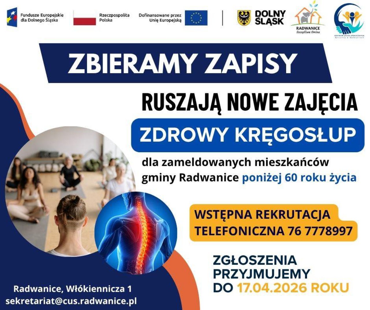 16-04-2026 08:36 Ruszają zapisy na zajęcia Zdrowy Kręgosłup Dyrektor Centrum Usług Społecznych Roszarnia w Radwanicach zaprasza! Rozpoczynamy zapisy na nowe zajęcia ruchowe dla mieszkańców! Zapraszamy zameldowanych mieszkańców gminy Radwanice poniżej 60 roku życia do udziału w bezpłatnych zajęciach: Zdrowy kręgosłup Wstępnej rekrutacji można dokonać osobiście w gab. Nr 1 lub pod numerem telefonu 76 777 89 97 DO 17.04.2026 ROKU Pierwsze zajęcia już wkrótce! Będą odbywać się raz w tygodniu w godzinach popołudniowych. Dlaczego warto dołączyć? Naszym celem jest: poprawa sprawności fizycznej zmniejszenie bólu pleców i napięć mięśniowych profilaktyka zdrowotna poprawa samopoczucia i jakości życia Kto może wziąć udział? Zameldowani mieszkańcy gminy Radwanice poniżej 60 roku życia, którzy chcą zadbać o swoje zdrowie i aktywność fizyczną. Nie zwlekaj – zadbaj o swój kręgosłup i dołącz do nas! Udział w zajęciach jest dobrowolny i całkowicie bezpłatny. Wstępne zgłoszenie nie jest równoznaczne z zakwalifikowaniem się do usługi. Pierwszeństwo mają osoby, które do tej pory nie korzystały z zajęć ruchowych w CUS Roszarnia. O zakwalifikowaniu będziemy informować telefonicznie. -------------------- Projekt realizowany w ramach „Tworzenie i rozwój CUS w Radwanicach”, współfinansowany przez Unię Europejską ze środków Europejskiego Funduszu Społecznego Plus w ramach Programu Fundusze Europejskie dla Dolnego Śląska 2021–2027, Priorytet nr 7 „Fundusze Europejskie na rzecz rynku pracy i włączenia społecznego na Dolnym Śląsku”, Działanie nr 7.7 „Rozwój usług społecznych i zdrowotnych”. #FunduszeUE #CUSRoszarnia #Radwanice #Aktywnie #FunduszeEuropejskie #DlaMieszkańców