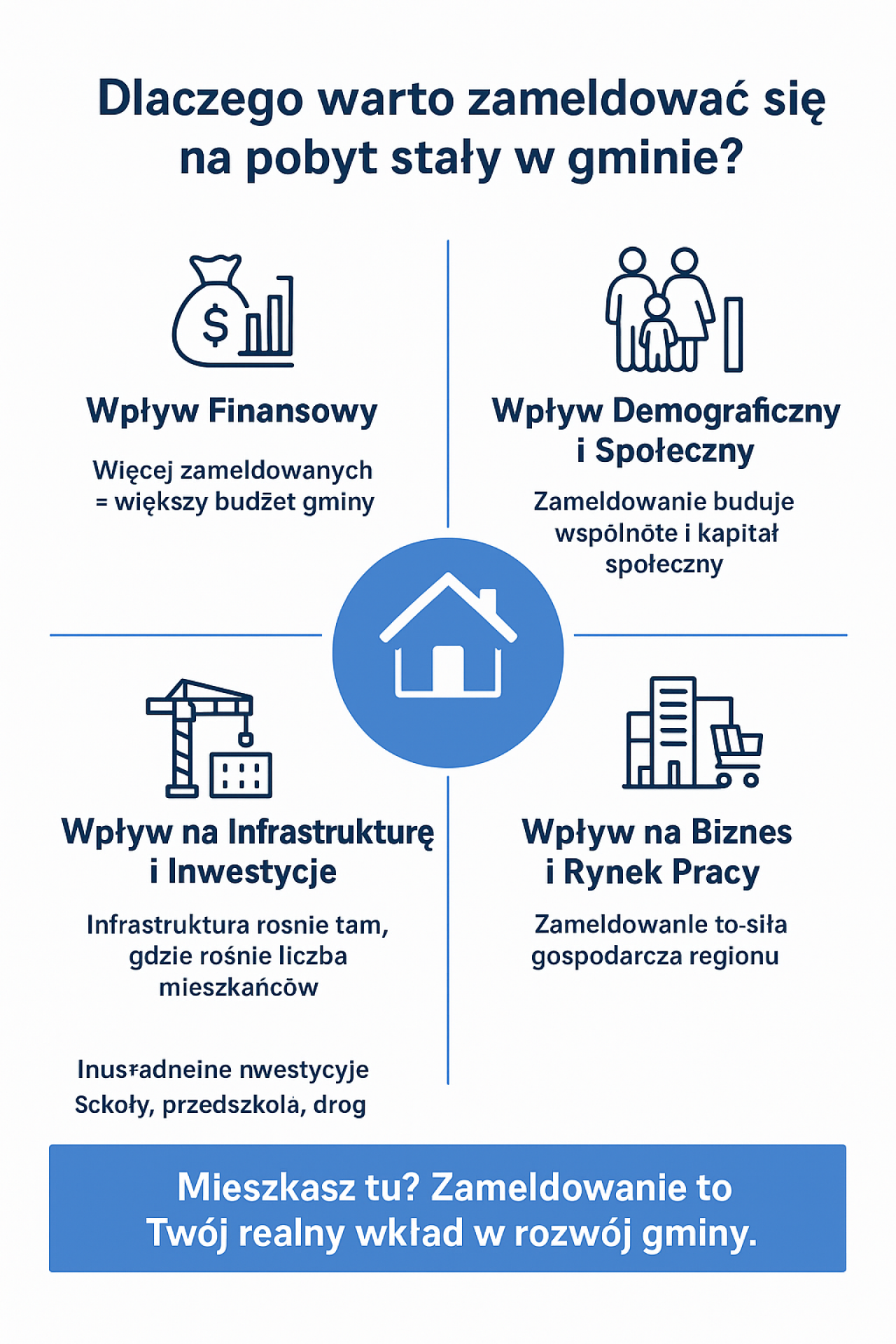 15-10-2025 12:33 Zameldowanie Dlaczego nie chcesz aby Twoja gmina się rozwijała? Zameldowanie na pobyt stały ma bardzo istotny, wielowymiarowy i pozytywny wpływ na rozwój gminy. Jest to jeden z kluczowych wskaźników demograficznych i społeczno-gospodarczych. Oto szczegółowy wpływ, podzielony na kategorie: 1. Wpływ Finansowy - najbardziej bezpośredni Gminy w Polsce otrzymują z budżetu państwa subwencję oświatową (potrzeby oświatowe) oraz część wyliczona część z dochodów zameldowanych mieszkańców. Im więcej osób jest zameldowanych na pobyt stały, tym większe są te wpływy. Subwencja oświatowa: Jej wysokość jest obliczana na podstawie liczby dzieci i młodzieży w wieku szkolnym zameldowanej na terenie gminy. Więcej zameldowanych dzieci = więcej pieniędzy na szkoły, przedszkola, wynagrodzenia nauczycieli i inwestycje w edukację. Udział w dochodach mieszkańców: Gmina otrzymuje rocznie około 7% z dochodów podatników od swoich mieszkańców (zameldowanych). Każda osoba pracująca na etacie i zameldowana na stałe generuje dla gminy konkretny, coroczny dochód. To są pieniądze, które gmina może przeznaczyć na dowolny cel: inwestycje drogowe, kulturę, sport, opiekę społeczną czy modernizację infrastruktury. Wniosek: Brak zameldowania, mimo faktycznego zamieszkiwania, pozbawia gminę tych kluczowych dochodów, co skutkuje „zaciskaniem pasa” i ogranicza możliwości inwestycyjne. 2. Wpływ Demograficzny i Społeczny Planowanie strategiczne: Liczba mieszkańców zameldowanych na pobyt stały jest podstawą do wszelkich analiz i planów rozwojowych. Na jej podstawie gmina: - Planuje zapotrzebowanie na miejsca w żłobkach, przedszkolach i szkołach. - Projektuje rozwój infrastruktury komunalnej (wodociągi, kanalizacja, gospodarka odpadami). - Szacuje zapotrzebowanie na usługi zdrowotne (przychodnie) i opiekę społeczną. Oficjalne dane demograficzne (liczba ludności, struktura wieku) są kluczowe przy ubieganiu się o unijne dotacje i granty. Projekty muszą być oparte na rzetelnych statystykach, aby miały szansę na dofinansowanie. Osoby zameldowane na stałe częściej utożsamiają się z miejscowością, angażują w życie lokalnej społeczności, uczestniczą w wyborach samorządowych i mają realny wpływ na kierunki rozwoju gminy. Buduje to kapitał społeczny. 3.Wpływ na Infrastrukturę i Inwestycje Uzasadnienie inwestycji: Budowa nowej szkoły, hali sportowej, domu kultury czy oczyszczalni ścieków musi być ekonomicznie uzasadniona. Inwestycje te opłacają się tylko przy odpowiedniej liczbie użytkowników. Niska liczba zameldowań może blokować kluczowe inwestycje, nawet jeśli faktyczna liczba mieszkańców jest duża - Transport i komunikacja: Liczba mieszkańców wpływa na planowanie tras i częstotliwości komunikacji publicznej, a także na inwestycje drogowe. 4. Wpływ na Biznes i Rynek Pracy Atrakcyjność inwestycyjna: Firmy poszukujące nowych lokalizacji analizują potencjał ludzki regionu. Gmina z rosnącą lub stabilną liczbą zameldowanych mieszkańców postrzegana jest jako atrakcyjny, dynamiczny rynek z siłą roboczą i potencjałem konsumenckim. Więcej mieszkańców to większy popyt na usługi: sklepy, gastronomię, fryzjerów, warsztaty, usługi medyczne. To stymuluje rozwój małej i średniej przedsiębiorczości. Podsumowując zameldowanie na pobyt stały to nie tylko formalność. To mechanizm redystrybucji środków publicznych i podstawa świadomego zarządzania rozwojem gminy. Dla mieszkańca to obowiązek, ale też przejaw troski o swoją „małą ojczyznę”, ponieważ bezpośrednio przekłada się na jej kondycję finansową i jakość życia wszystkich jej mieszkańców. Gminy o stabilnej lub rosnącej liczbie stałych mieszkańców są po prostu bogatsze, lepiej zarządzane i atrakcyjniejsze do życia. Obowiązek meldunkowy – co mówią przepisy? W 2025 roku w Polsce nadal obowiązuje obowiązek meldunkowy na podstawie Ustawy o ewidencji ludności, który dotyczy zarówno obywateli polskich, jak i cudzoziemców przebywających na terytorium RP. Obowiązek ten polega na zgłoszeniu pobytu stałego lub czasowego w urzędzie gminy najpóźniej w ciągu 30 dni od przybycia do nowego miejsca. Chociaż w latach poprzednich kary za niedopełnienie obowiązku meldunkowego były zaniechane, to dużo mówi się, że w najbliższym czasie przepisy dotyczące sankcji mają być ponownie wprowadzone i egzekwowane, a za brak zameldowania grozić będzie grzywna. Nie czekaj do ostatniej chwili – zamelduj się już dziś i miej udział w rozwoju miejsca swojego zamieszkania. Podstawy prawne i aktualność obowiązku Ustawa o ewidencji ludności: Polski system prawny opiera się na Ustawie z dnia 24 września 2010 r. o ewidencji ludności, która nakłada obowiązek meldunkowy na wszystkie osoby przebywające w Polsce. Obowiązek stały i aktualny: Obowiązek meldunkowy jest nadal obowiązujący i nie został zniesiony. To nie prawda co mówią: Pomimo powszechnego przekonania o rezygnacji z meldunku, nadal jest to wymaganie prawne, a nie jedynie nieistotna formalność z przeszłości. Kogo dotyczy obowiązek? Obywatele polscy: Każdy obywatel polski przebywający na terytorium Polski ma obowiązek meldowania się. Cudzoziemcy: Obowiązek meldunkowy dotyczy również cudzoziemców przebywających w Polsce. Termin i procedura Termin 30 dni: Zameldowanie należy wykonać najpóźniej w ciągu 30 dni od przybycia do nowego miejsca zamieszkania. Rodzaje meldunku: Można mieć jednocześnie jedno miejsce pobytu stałego i jedno miejsce pobytu czasowego. Konsekwencje braku meldunku od 2026 roku Powrót sankcji: Po latach, gdy przepisy były rzadko egzekwowane, w najbliższym czasie ma się to zmienić - kary za niedopełnienie obowiązku meldunkowego mają być ściśle egzekwowane.
