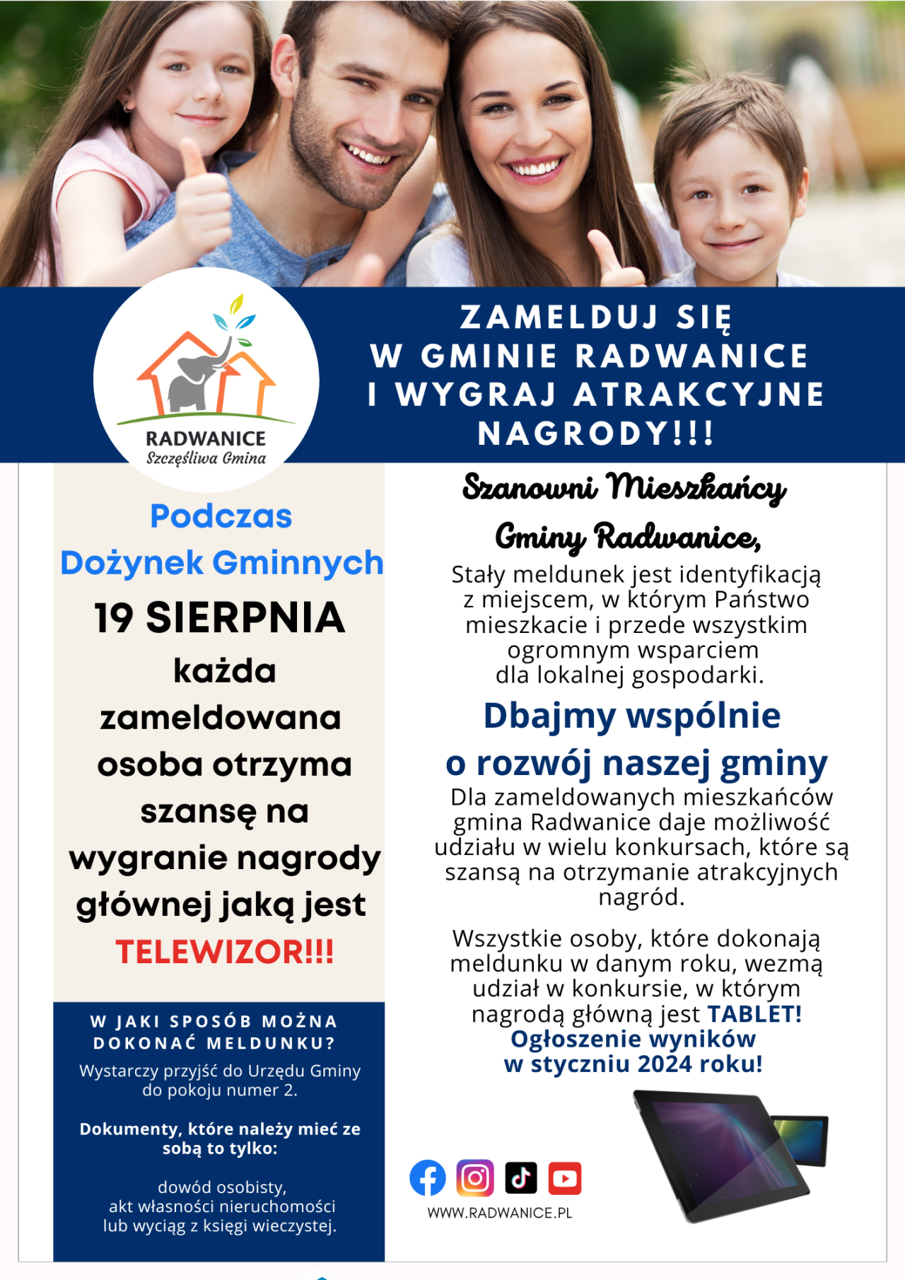 25-07-2023 06:21 Zamelduj się w Gminie Radwanice i Wygraj Telewizor !!! Wszyscy pełnoletni mieszkańcy gminy Radwanice podczas Dożynek gminnych mają szansę na wygranie Telewizora! Dożynkowa edycja konkursu "Zamelduj Się" skierowana jest do wszystkich pełnoletnich zameldowanych mieszkańców gminy Radwanice. Każda osoba będzie miała szansę na wygranie Telewizora. Wystarczy tylko udać się do stosika Urzędu Gminy i zgłosić swój udział w konkursie. Jeśli nie Jesteście Państwo jeszcze zameldowani nic straconego! Wystarczy krótka wizyta w Urzędzie Gminy (pokój numer 2) aby dokonać wszystkich formalności. #Zameldujsię