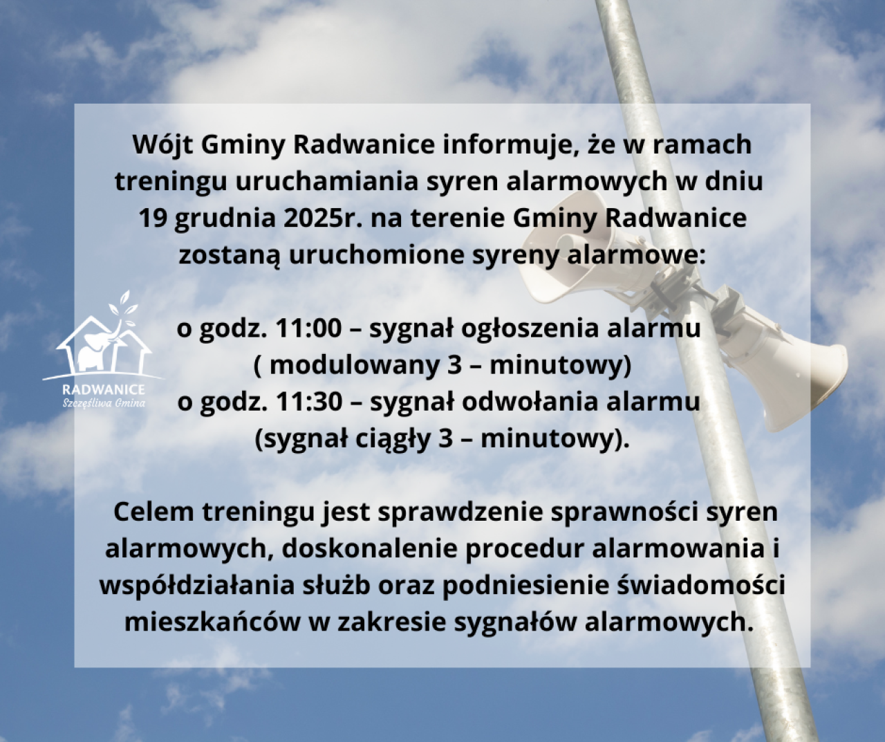 18-12-2025 08:49 Trening uruchamiania syren alarmowych na terenie Gminy Radwanice – 19 grudnia 2025 r.