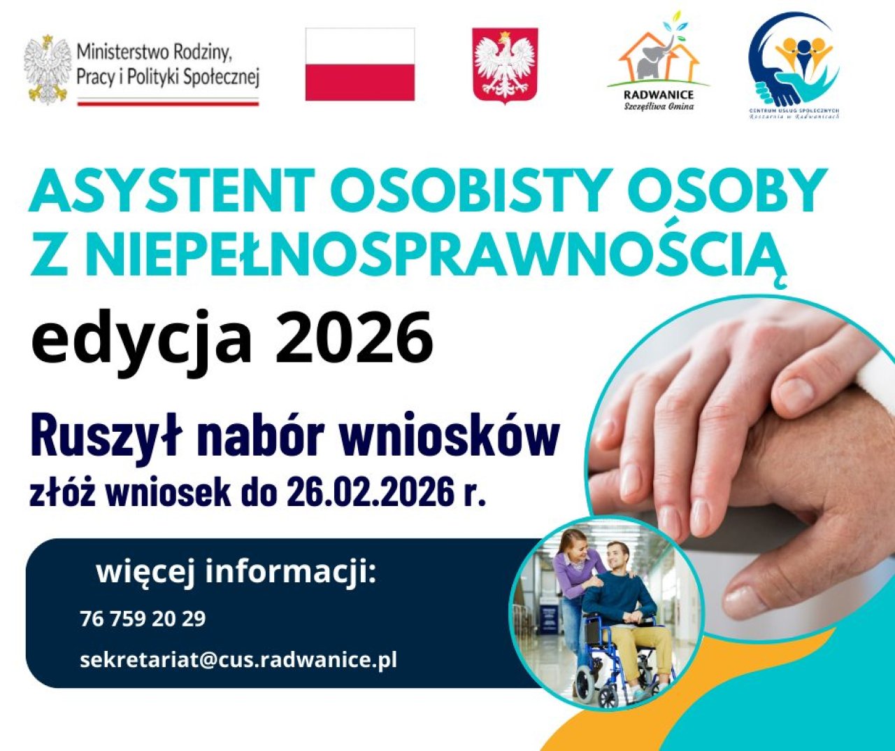 24-02-2026 09:36 Asystent osobisty osoby z niepełnosprawnością dla Jednostek Samorządu Terytorialnego- edycja 2026 Rozpoczął się nabór wniosków w ramach programu resortowego Ministra Rodziny i Polityki Społecznej„Asystent osobisty osoby z niepełnosprawnością” dla Jednostek Samorządu Terytorialnego- edycja 2026. Rozpoczął się nabór wniosków w ramach programu resortowego Ministra Rodziny i Polityki Społecznej„Asystent osobisty osoby z niepełnosprawnością” dla Jednostek Samorządu Terytorialnego- edycja 2026. Głównym celem Programu jest wprowadzenie usług asystenta osobistego osoby niepełnosprawnej jako formy ogólnodostępnego wsparcia dla uczestników Programu: 1. Dzieciom do 16. roku życia z orzeczeniem o niepełnosprawności łącznie ze wskazaniami: konieczności stałej lub długotrwałej opieki lub pomocy innej osoby w związku ze znacznie ograniczoną możliwością samodzielnej egzystencji oraz konieczności stałego współudziału na co dzień opiekuna dziecka w procesie jego leczenia, rehabilitacji i edukacji oraz 2. Osobom niepełnosprawnym posiadającym orzeczenie: a) o znacznym stopniu niepełnosprawności albo b) o umiarkowanym stopniu niepełnosprawności albo c) traktowane na równi z orzeczeniami wymienionymi w lit. a i b, zgodnie z art. 5 i art. 62 ustawy z dnia 27 sierpnia 1997 r. o rehabilitacji zawodowej i społecznej oraz zatrudnianiu osób niepełnosprawnych Celem Programu jest zapewnienie mieszkańcom Gminy Radwanice dostępności do usługi asystenta tj. wsparcia w wykonywaniu codziennych czynności, w funkcjonowaniu w życiu społecznym m.in.: poprzez zaangażowanie osób niepełnosprawnych w wydarzenia społeczne, kulturalne, rozrywkowe lub sportowe. Korzystanie z usług asystenta jest bezpłatne. Ważne! 1. Usługi asystencji osobistej mogą świadczyć osoby, niebędące członkami rodziny uczestnika: 1) posiadające dokument potwierdzający uzyskanie kwalifikacji w następujących kierunkach: asystent osoby niepełnosprawnej, opiekun osoby starszej, opiekun medyczny, pedagog, psycholog, terapeuta zajęciowy, pielęgniarka, fizjoterapeuta; lub 2) posiadające co najmniej 6-miesięczne, udokumentowane doświadczenie w udzielaniu bezpośredniej pomocy osobom niepełnosprawnym np. doświadczenie zawodowe, udzielanie wsparcia osobom niepełnosprawnym w formie wolontariatu; lub 3) wskazane przez uczestnika lub jego opiekuna prawnego, pod warunkiem, że osoba wskazana spełnia przynajmniej jeden z warunków, o których mowa w pkt 1 lub 2. Posiadanie doświadczenia, o którym mowa w pkt 2, może zostać udokumentowane pisemnym oświadczeniem podmiotu, który zlecał udzielanie bezpośredniej pomocy osobom niepełnosprawnym. Procedura zgłoszenia uczestników Programu W celu dołączenia do Programu należy dostarczyć komplet dokumentów, który stanowią: 1. Karta zgłoszenia do Programu. 2. Kopia orzeczenia o niepełnosprawności; 3. Zakres czynności asystenta; 4. Podpisana informacja dotycząca przetwarzania danych osobowych (2 szt.) Ważne! • Złożenie wniosku nie jest jednoznaczne z przyznaniem pomocy asystenta osobistego osoby z niepełnosprawnością. Ostateczna kwalifikacja uczestników Programu uzależniona jest przede wszystkim od otrzymanych środków finansowych na realizację programu oraz liczby zgłoszonych osób. Druki do pobrania w siedzibie Centrum usług Społecznych Roszarnia w Radwanicach w godzinach pracy. Komplet dokumentów należy składać do dnia 26 lutego 2026 r. do 15:30 w siedzibie Centrum Usług Społecznych Roszarnia w Radwanicach, ul. Przemysłowa 7a, 59-160 Radwanice lub za pośrednictwem poczty na adres jw. Po 26 lutym 2026 r. nabór będzie nadal otwarty, lecz usługi asystenckie będą przyznawane pod warunkiem dostępnych środków finansowych w ramach Funduszu Solidarnościowego. W przypadku pytań, wątpliwości lub trudności z wypełnieniem dokumentów prosimy o kontakt telefoniczny z Centrum Usług Społecznych Roszarnia w Radwanicach