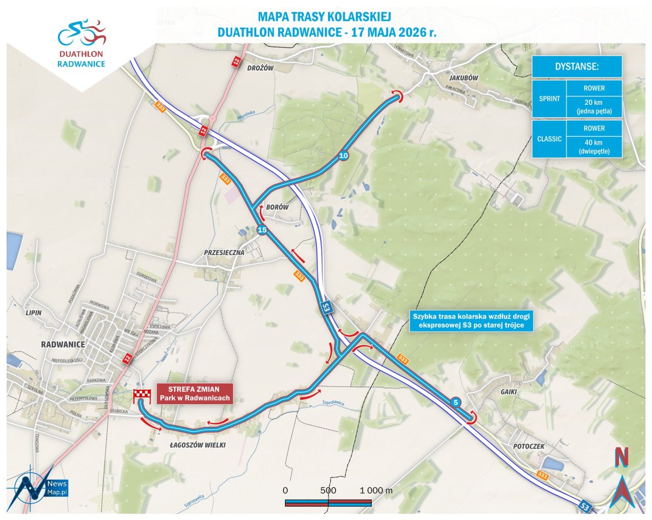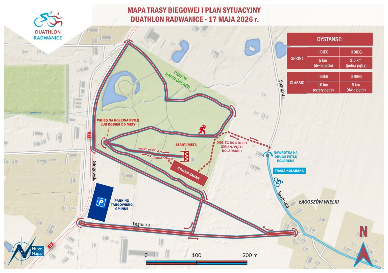 13-04-2026 08:43 Duathlon po raz kolejny w Radwanicach! Już 17 maja zapraszamy na sportową przygodę w Radwanicach Duathlon po raz kolejny w Radwanicach. Już 17 maja 2026 roku zapraszamy śmiałków, którym nie obcy jest wysiłek na trasie i pokonywanie swoich słabości. W edycji 2026 wprowadzamy kilka zmian, które wpłyną na przebieg rywalizacji. Nowa trasa kolarska: Szybka, płaska pętla wzdłuż drogi S3, bez progów zwalniających i zbędnych zakrętów. Pojawia się też krótki podjazd, który sprawdzi formę. Nowa trasa biegowa: Płaska, szybka pętla poprowadzona przez park w Radwanicach. Nawierzchnia asfaltowo-szutrowa i dobre warunki do utrzymania tempa. Start w formule NON DRAFTING i możliwość ścigania się na dowolnym rowerze bez wspomagania elektrycznego lub spalinowego. ZAPISY: [https://dostartu.pl/mse-duathlon-radwanice-v14837](https://dostartu.pl/mse-duathlon-radwanice-v14837) Do zobaczenia na starcie Sponsorem imprezy jest firma KGHM Polska Miedź S. A. Więcej informacji w Domu Kultury w Radwanicach 768316873.
