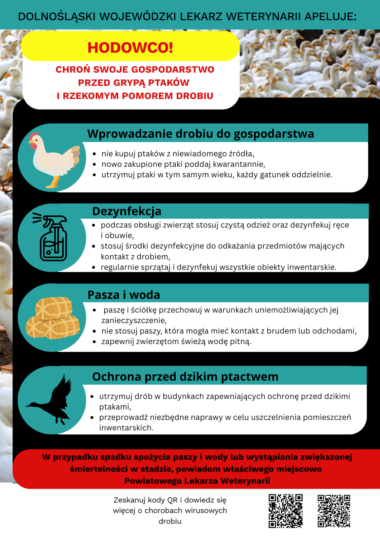 31-12-2025 09:28 Grypa ptaków i rzekomy pomór drobiu – jak skutecznie chronić swoje gospodarstwo? Grypa ptaków oraz rzekomy pomór drobiu to jedne z najgroźniejszych chorób wirusowych występujących u drobiu. Ich pojawienie się w stadzie może prowadzić do poważnych strat ekonomicznych, a także do konieczności likwidacji całego pogłowia. Dolnośląski Wojewódzki Lekarz Weterynarii apeluje do hodowców o zachowanie szczególnej ostrożności i bezwzględne przestrzeganie zasad bioasekuracji. Bezpieczne wprowadzanie drobiu do gospodarstwa Jednym z najczęstszych sposobów zawleczenia choroby do gospodarstwa jest zakup ptaków z niepewnego źródła. Aby ograniczyć ryzyko: nie należy kupować drobiu z niewiadomego pochodzenia ani bez wymaganych dokumentów, nowo zakupione ptaki powinny zostać poddane kwarantannie przed dołączeniem do stada, należy utrzymywać ptaki w tym samym wieku, a różne gatunki drobiu hodować oddzielnie. Takie działania znacząco zmniejszają ryzyko przeniesienia wirusa pomiędzy ptakami. Dezynfekcja – klucz do bioasekuracji Higiena w gospodarstwie to podstawa ochrony przed chorobami zakaźnymi. Podczas obsługi drobiu należy: stosować czystą, przeznaczoną wyłącznie do tego celu odzież, regularnie dezynfekować ręce oraz obuwie, używać odpowiednich środków dezynfekcyjnych do odkażania narzędzi, sprzętu i innych przedmiotów mających kontakt z drobiem, systematycznie sprzątać i dezynfekować pomieszczenia inwentarskie. Konsekwentne przestrzeganie zasad dezynfekcji znacznie ogranicza możliwość rozprzestrzeniania się wirusów. Pasza i woda – czyste i bezpieczne Równie ważnym elementem profilaktyki jest odpowiednie przechowywanie paszy i ściółki. Powinny być one zabezpieczone przed dostępem dzikich ptaków oraz gryzoni, a także przed zanieczyszczeniem odchodami. Nie wolno stosować paszy, która mogła mieć kontakt z brudem lub nieczystościami. Zwierzęta muszą mieć stały dostęp do świeżej, czystej wody pitnej. Ochrona przed dzikim ptactwem Dzikie ptaki są jednym z głównych rezerwuarów wirusa grypy ptaków. Dlatego: drób należy utrzymywać w budynkach lub na wybiegach zabezpieczonych przed dostępem dzikiego ptactwa, konieczne jest uszczelnienie pomieszczeń inwentarskich oraz naprawa wszelkich uszkodzeń, przez które mogą dostać się obce zwierzęta. Reaguj szybko na niepokojące objawy Każdy hodowca powinien uważnie obserwować swoje stado. Spadek spożycia paszy i wody, apatia ptaków lub zwiększona śmiertelność mogą być pierwszymi objawami choroby zakaźnej. W takiej sytuacji należy niezwłocznie powiadomić właściwego miejscowo Powiatowego Lekarza Weterynarii. Świadomość i profilaktyka to najlepsza ochrona Stosowanie zasad bioasekuracji to nie tylko obowiązek, ale przede wszystkim skuteczny sposób ochrony własnego gospodarstwa i całej okolicy przed rozprzestrzenianiem się groźnych chorób drobiu. Warto regularnie poszerzać swoją wiedzę i korzystać z dostępnych materiałów informacyjnych, m.in. poprzez skanowanie kodów QR zamieszczonych na materiałach urzędowych. Odpowiedzialne działania hodowców mają kluczowe znaczenie dla bezpieczeństwa zdrowotnego drobiu i stabilności produkcji rolnej.