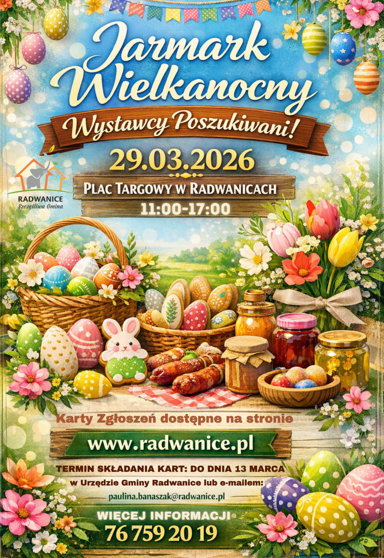 26-01-2026 07:05 Jarmark Wielkanocny w Radwanicach WYSTAWCY POSZUKIWANI Jarmark Wielkanocny w Radwanicach 29 marca 2026 r. Z radością zapraszamy Wystawców do udziału w naszym Jarmarku Wielkanocnym! Jeśli kochasz tradycję, lokalne smaki, rękodzieło i świąteczny klimat — nie może Cię zabraknąć Udział Wystawców jest BEZPŁATNY. Zgłoszenia przyjmujemy do 13 marca 2026 r. Karty zgłoszeniowe znajdziecie: w komentarzu pod tym postem na stronie www.radwanice.pl Masz pytania? Zadzwoń: 76 759 20 19 Obiecujemy wyjątkową atmosferę — piękną oprawę, świetny repertuar artystyczny oraz mnóstwo atrakcji dla całych rodzin. Będzie radośnie, kolorowo i naprawdę świątecznie Szukamy wystawców, w szczególności: producentów wyrobów regionalnych twórców naturalnych przetworów, dżemów i soków, miodów, piekarzy, cukierników producentów serów, wędlin rękodzielników i artystów twórców ozdób wielkanocnych Dołącz do nas i współtwórz Jarmark Wielkanocny w Radwanicach — razem stwórzmy wydarzenie pełne smaku, tradycji i wiosennej energii! KARTA ZGŁOSZENIA