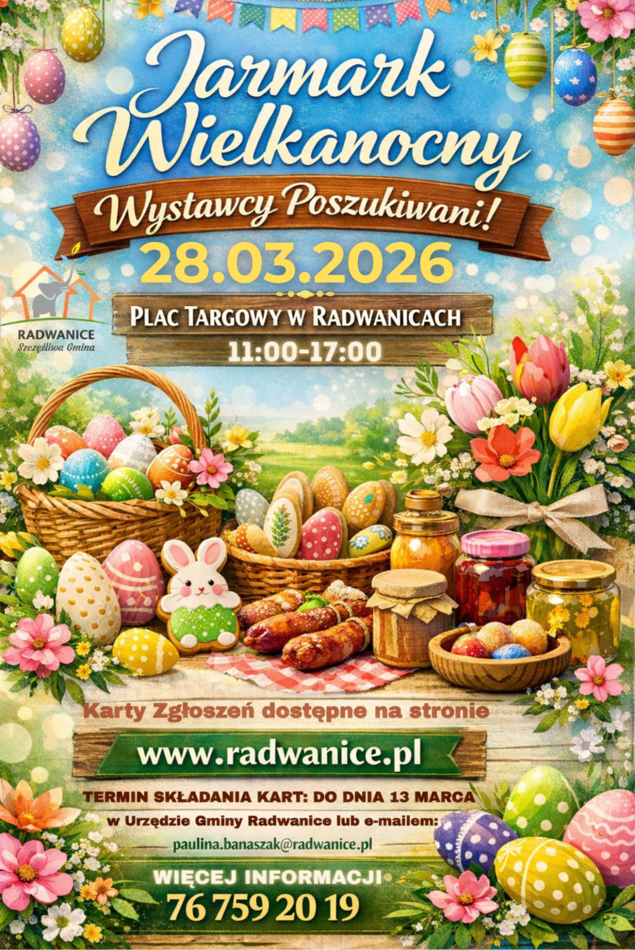03-03-2026 07:05 Jarmark Wielkanocny w Radwanicach WYSTAWCY POSZUKIWANI Jarmark Wielkanocny w Radwanicach 28 marca 2026 r. Z radością zapraszamy Wystawców do udziału w naszym Jarmarku Wielkanocnym! Jeśli kochasz tradycję, lokalne smaki, rękodzieło i świąteczny klimat — nie może Cię zabraknąć Udział Wystawców jest BEZPŁATNY. Zgłoszenia przyjmujemy do 13 marca 2026 r. Masz pytania? Zadzwoń: 76 759 20 19 Obiecujemy wyjątkową atmosferę — piękną oprawę, świetny repertuar artystyczny oraz mnóstwo atrakcji dla całych rodzin. Będzie radośnie, kolorowo i naprawdę świątecznie Szukamy wystawców, w szczególności: producentów wyrobów regionalnych twórców naturalnych przetworów, dżemów i soków, miodów, piekarzy, cukierników producentów serów, wędlin rękodzielników i artystów twórców ozdób wielkanocnych Dołącz do nas i współtwórz Jarmark Wielkanocny w Radwanicach — razem stwórzmy wydarzenie pełne smaku, tradycji i wiosennej energii! KARTA ZGŁOSZENIA REGULAMIN