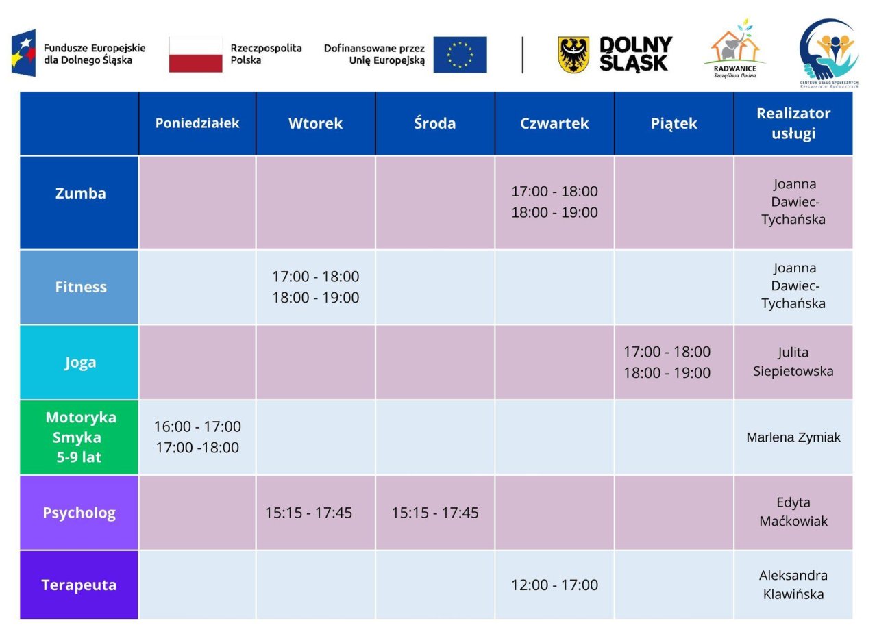 11-03-2026 10:05 Sprawdź Harmonogram zajęć w Centrum Usług Społecznych Roszarnia Ze względu na ogromne zainteresowanie mieszkańców zajęciami ruchowymi w Centrum Usług Społecznych Roszarnia postanowiono rozbudować ofertę o dodatkowe godziny zajęć Przypominamy, że kwalifikacja na działania odbywała się do piątku 6 marca 2026 roku, w oparciu o wnioski. Są już pełne grupy na bezpłatne zajęcia ruchowe w ramach Projektu. Zachęcajmy natomiast do skorzystania z: - indywidualnych konsultacji psychologicznych - poradnictwa terapeutycznego Wnioski będą dostępne w gabinetach, w godzinach przyjmowania specjalistów. Projekt finansowany w ramach „Tworzenie i rozwój CUS w Radwanicach”, współfinansowany przez Unię Europejską ze środków Europejskiego Funduszu Społecznego Plus w ramach Programu Fundusze Europejskie dla Dolnego Śląska 2021–2027, Priorytet nr 7 „Fundusze Europejskie na rzecz rynku pracy i włączenia społecznego na Dolnym Śląsku”, Działanie nr 7.7 „Rozwój usług społecznych i zdrowotnych”.