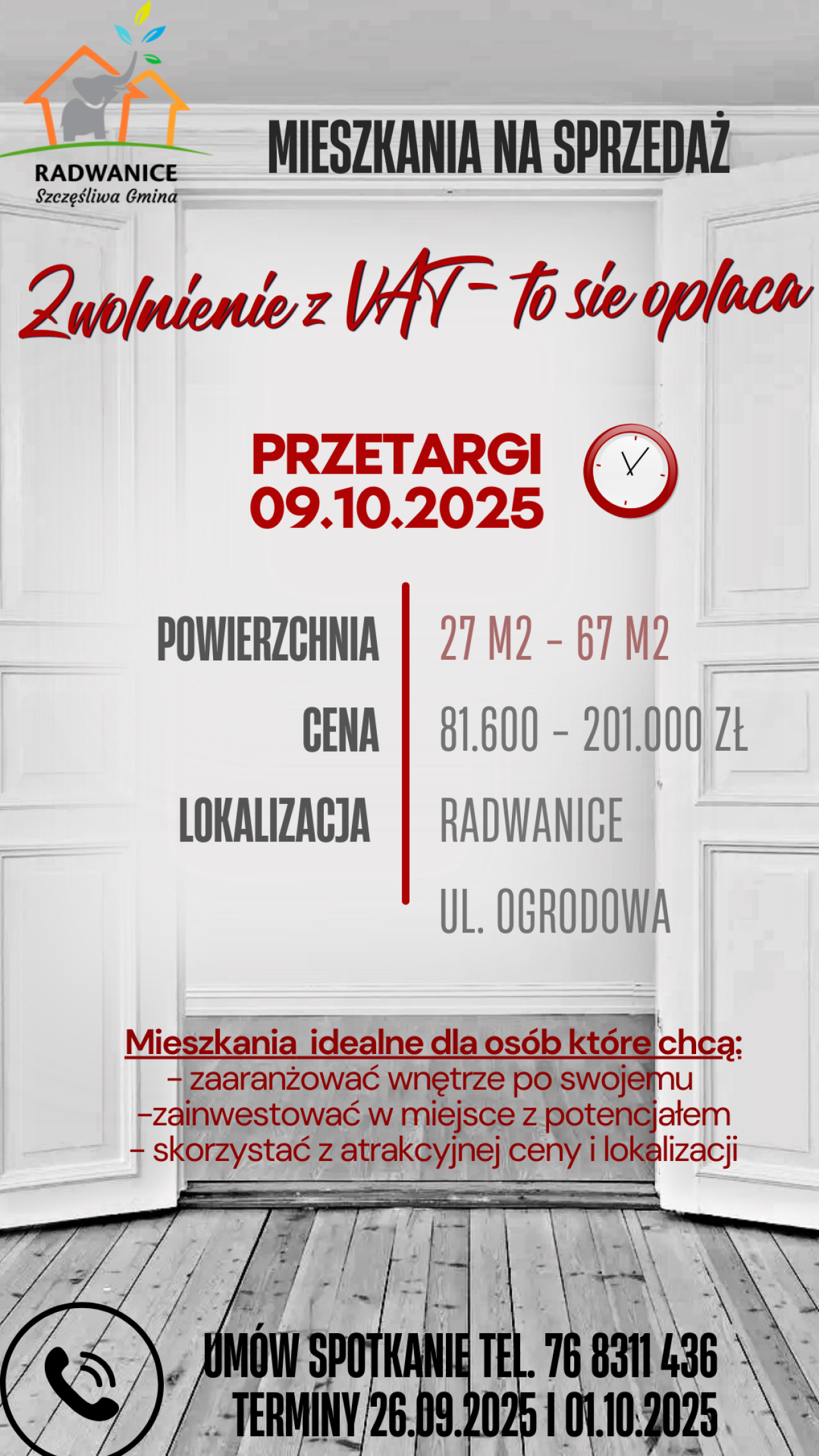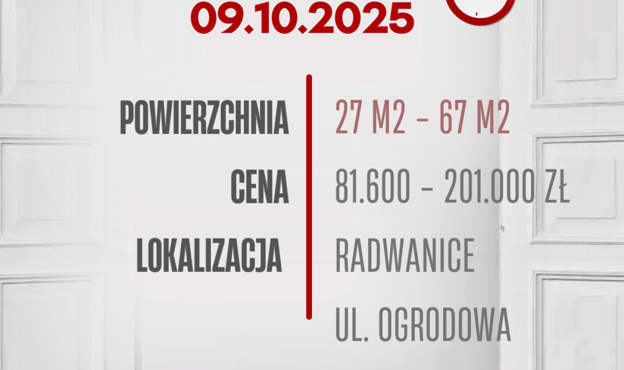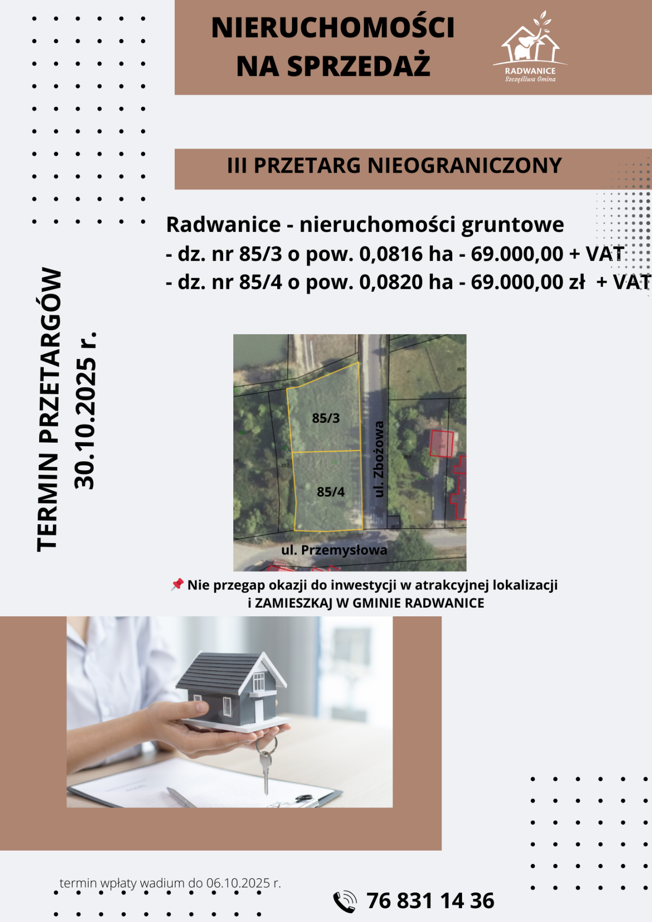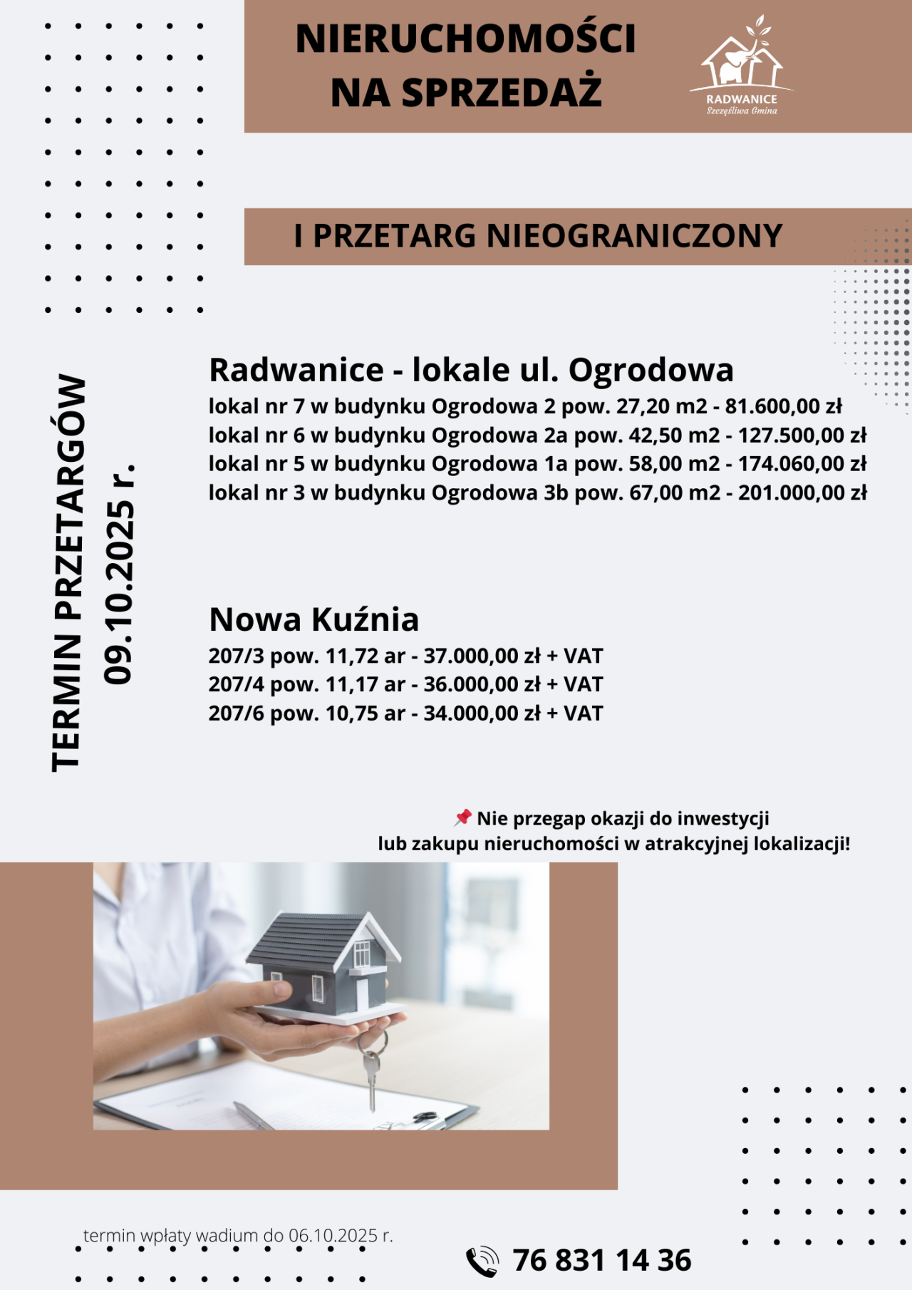 29-09-2025 11:47 Nieruchomości na sprzedaż w gminie Radwanice – przetargi październik 2025 Nieruchomości na sprzedaż w gminie Radwanice – przetargi październik 2025 Gmina Radwanice ogłasza przetargi nieograniczone na sprzedaż atrakcyjnych nieruchomości – zarówno lokali mieszkalnych, jak i gruntów inwestycyjnych. To wyjątkowa okazja dla osób poszukujących miejsca do zamieszkania, inwestorów oraz przedsiębiorców zainteresowanych rozwojem na terenie prężnie rozwijającej się gminy. Lokale mieszkalne – ul. Ogrodowa, Radwanice W pierwszym przetargu, zaplanowanym na 09.10.2025 r., do sprzedaży przeznaczono mieszkania o powierzchni od 27 m² do 67 m². Ceny lokali mieszczą się w przedziale 81.600 zł – 201.000 zł. Oferta obejmuje m.in.: lokal nr 7 (27,20 m² – 81.600 zł), lokal nr 6 (42,50 m² – 127.500 zł), lokal nr 5 (58,00 m² – 174.060 zł), lokal nr 3 (67,00 m² – 201.000 zł). Dodatkowym atutem jest zwolnienie z podatku VAT, co czyni zakup jeszcze bardziej opłacalnym. Mieszkania idealnie nadają się dla osób, które chcą samodzielnie zaaranżować wnętrze, zainwestować w miejsce z potencjałem lub skorzystać z atrakcyjnej ceny i lokalizacji. Grunty w Nowej Kuźni W ramach tego samego przetargu sprzedawane będą również działki w Nowej Kuźni: działka nr 207/3 (11,72 ar – 37.000 zł + VAT), działka nr 207/4 (11,17 ar – 36.000 zł + VAT), działka nr 207/6 (10,75 ar – 34.000 zł + VAT). Nieruchomości gruntowe – Radwanice Kolejna okazja pojawi się 30.10.2025 r., podczas III przetargu nieograniczonego. Do sprzedaży przeznaczone zostaną działki położone przy ul. Zbożowej i Przemysłowej w Radwanicach: działka nr 85/3 (0,0816 ha – 69.000 zł + VAT), działka nr 85/4 (0,0820 ha – 69.000 zł + VAT). Warunki przetargów termin wpłaty wadium: do 06.10.2025 r., szczegóły dotyczące nieruchomości można uzyskać pod numerem telefonu 76 831 14 36, dodatkowo istnieje możliwość wcześniejszego umówienia spotkania i obejrzenia lokali – terminy: 26.09.2025 r. oraz 01.10.2025 r.. Nie przegap okazji do inwestycji lub zakupu nieruchomości w atrakcyjnej lokalizacji! Gmina Radwanice stwarza wyjątkowe warunki dla osób, które chcą zamieszkać w nowoczesnych mieszkaniach, zaaranżować je według własnych potrzeb lub poszukują gruntów z potencjałem inwestycyjnym.