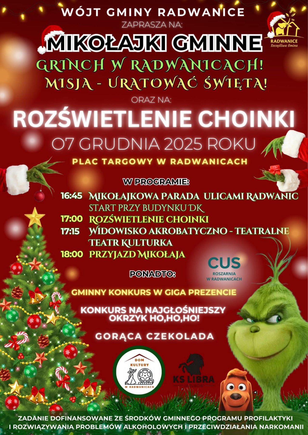 25-11-2025 02:12 Zapraszamy na Mikołajki Gminne Gminne Mikołajki w Radwanicach już 07 grudnia! A razem z nami… GRINCH! Tak, tak – ten prawdziwy! Czy świąteczna atmosfera sprawi, że zmieni swoje nastawienie do Świąt? Przyjdźcie i sprawdźcie sami! Startujemy o 16:45 kolorową PARADĄ spod DK! Prognozy mówią, że będzie ciepło, więc nie bójcie się pogody! Przebrania mile widziane – szczególnie u najmłodszych! Niech będzie kolorowo, bajkowo i świątecznie! O 17:00- wspólnie odliczamy i rozświetlamy naszą gminną choinkę na Placu Targowym! O 17:15 – widowisko teatralno–akrobatyczne! A o 18:00… przyjeżdża ON! ŚWIĘTY MIKOŁAJ z paczkami dla dzieci! Do tego: gorąca czekolada, konkursy gminne, konkurs na najgłośniejszy śmiech „Ho, ho, ho!!!”. Zapowiada się MAAAAGICZNIEEE Wpadajcie całymi rodzinami i bawmy się razem!