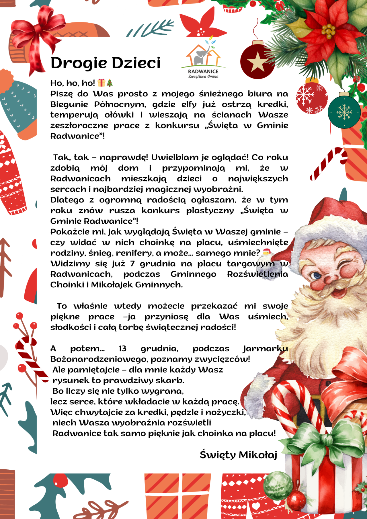 06-12-2025 02:12 Zapraszamy na Mikołajki Gminne Gminne Mikołajki w Radwanicach już 07 grudnia! A razem z nami… GRINCH! Tak, tak – ten prawdziwy! Czy świąteczna atmosfera sprawi, że zmieni swoje nastawienie do Świąt? Przyjdźcie i sprawdźcie sami! Startujemy o 16:45 kolorową PARADĄ spod DK! Prognozy mówią, że będzie ciepło, więc nie bójcie się pogody! Przebrania mile widziane – szczególnie u najmłodszych! Niech będzie kolorowo, bajkowo i świątecznie! O 17:00- wspólnie odliczamy i rozświetlamy naszą gminną choinkę na Placu Targowym! O 17:15 – widowisko teatralno–akrobatyczne! A o 18:00… przyjeżdża ON! ŚWIĘTY MIKOŁAJ z paczkami dla dzieci! Do tego: gorąca czekolada, konkursy gminne, konkurs na najgłośniejszy śmiech „Ho, ho, ho!!!”. Zapowiada się MAAAAGICZNIEEE Wpadajcie całymi rodzinami i bawmy się razem! PS: NIE ZAPOMNICJIE RYSUNKÓW DLA MIKOŁAJA!
