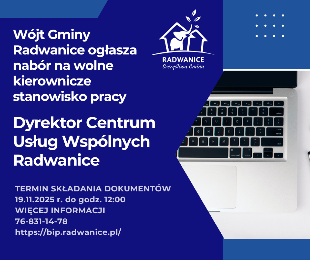 06-11-2025 09:12 Wójt Gminy Radwanice ogłasza nabór na wolne kierownicze stanowisko pracy Dyrektor Centrum Usług Wspólnych Radwanice Wójt Gminy Radwanice ogłasza nabór na wolne kierownicze stanowisko pracy: Dyrektor Centrum Usług Wspólnych Radwanice. Więcej informacji: https://bip.radwanice.pl/nabor-na-wolne-kierownicze...