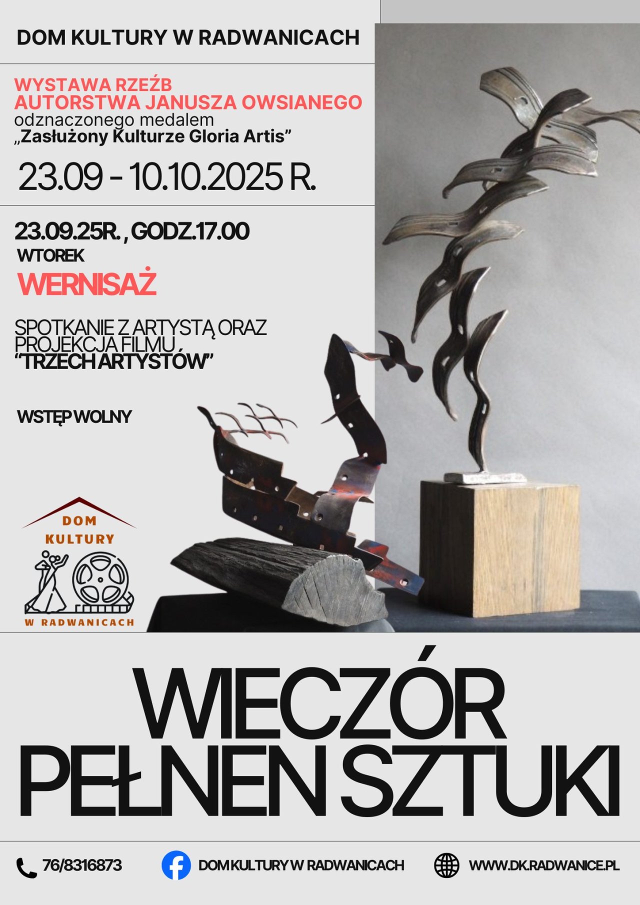 22-09-2025 09:44 WIECZÓR PEŁEN SZTUKI W DK Serdecznie zapraszamy Państwa na wernisaż prac autorstwa artysty rzeźbiarza JANUSZA OWSIANEGO, odznaczonego za swoją twórczość Medalem „Zasłużony Kulturze Gloria Artis”. Pan Janusz w tym roku obchodzi jubileusz 43-lecia pracy twórczej, a inspirację do swoich dzieł czerpie z natury oraz głębokich pytań o sens istnienia człowieka. Jego prace są pełne metafizycznego wymiaru oraz symboliki. O godz. 17.30 po spotkaniu z artysta zapraszamy na projekcję filmu dokumentalnego pt.: TRZECH WSPANIAŁYCH", opowiadającym o trzech artystach o Panu Januszu oraz o Dariuszu Saganie i Krzysztofie Pietrzaku. Będzie to opowieść o sztuce w trzech wymiarach: rzeźby, muzyki i poezji. Zapraszamy serdecznie Wstęp wolny:-)