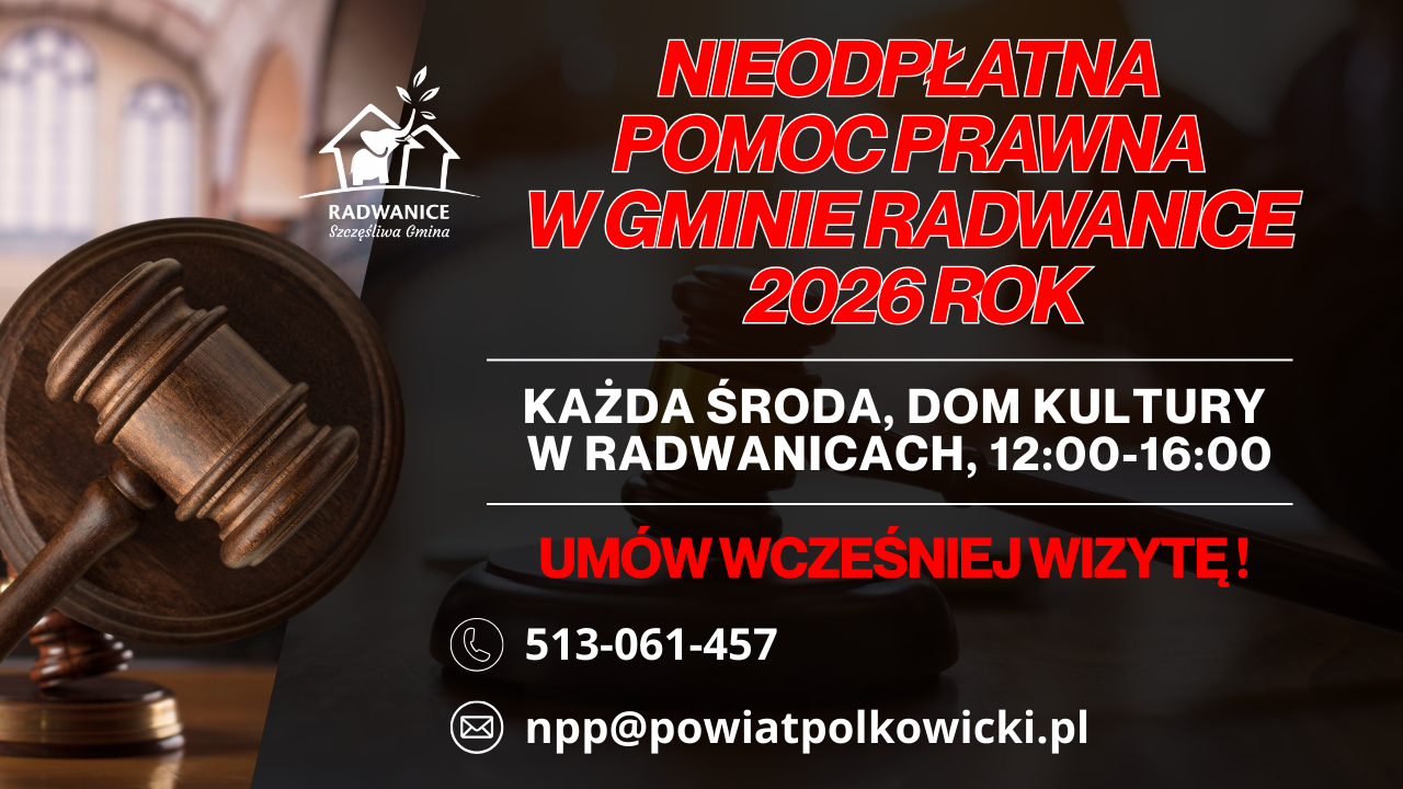 07-01-2026 02:17 Nieodpłatna Pomoc Prawna w Gminie Radwanie Nieodpłatna pomoc prawna w Gminie Radwanice Mieszkańcy Gminy Radwanice mogą skorzystać z bezpłatnych porad prawnych świadczonych przez współpracujących radców prawnych. Porady w Radwanicach odbywają się w każdą środę w godzinach 12:00–16:00 w Domu Kultury. Ważne: wizytę należy umówić wcześniej. Zapisy: 513 061 457 @npp@powiatpolkowicki.pl