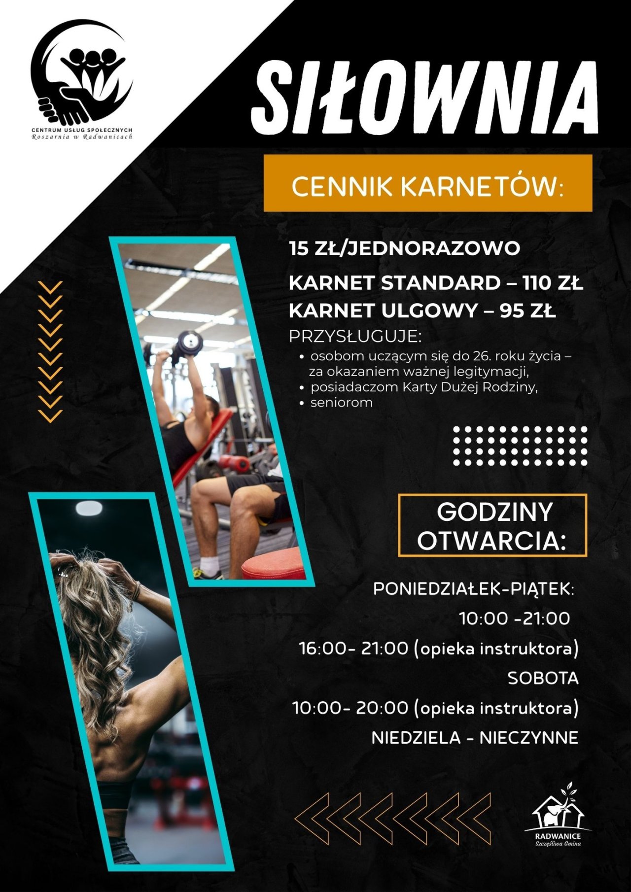 12-03-2026 09:40 Siłownia w Centrum Usług Społecznych Roszarnia otwarta! Dzisiaj startuje siłownia w Centrum Usług Społecznych Roszarnia! To idealne miejsce, aby zadbać o formę, zdrowie i dobre samopoczucie. Zapraszamy zarówno osoby początkujące, jak i bardziej zaawansowane – każdy znajdzie coś dla siebie! Cennik • Wejście jednorazowe – 15 zł • Karnet standard – 110 zł • Karnet ulgowy – 95 zł Karnet ulgowy przysługuje: – uczniom do 26 r.ż. z ważną legitymacją – posiadaczom Karty Dużej Rodziny – seniorom Godziny otwarcia Poniedziałek – Piątek: 10:00–21:00 w godzinach 16:00–21:00 opieka instruktora (z wyjątkiem środy) Sobota: 10:00–20:00 w godzinach otwarcia opieka instruktora Niedziela: nieczynne Zapraszamy wszystkich mieszkańców do wspólnego treningu! Do zobaczenia na siłowni