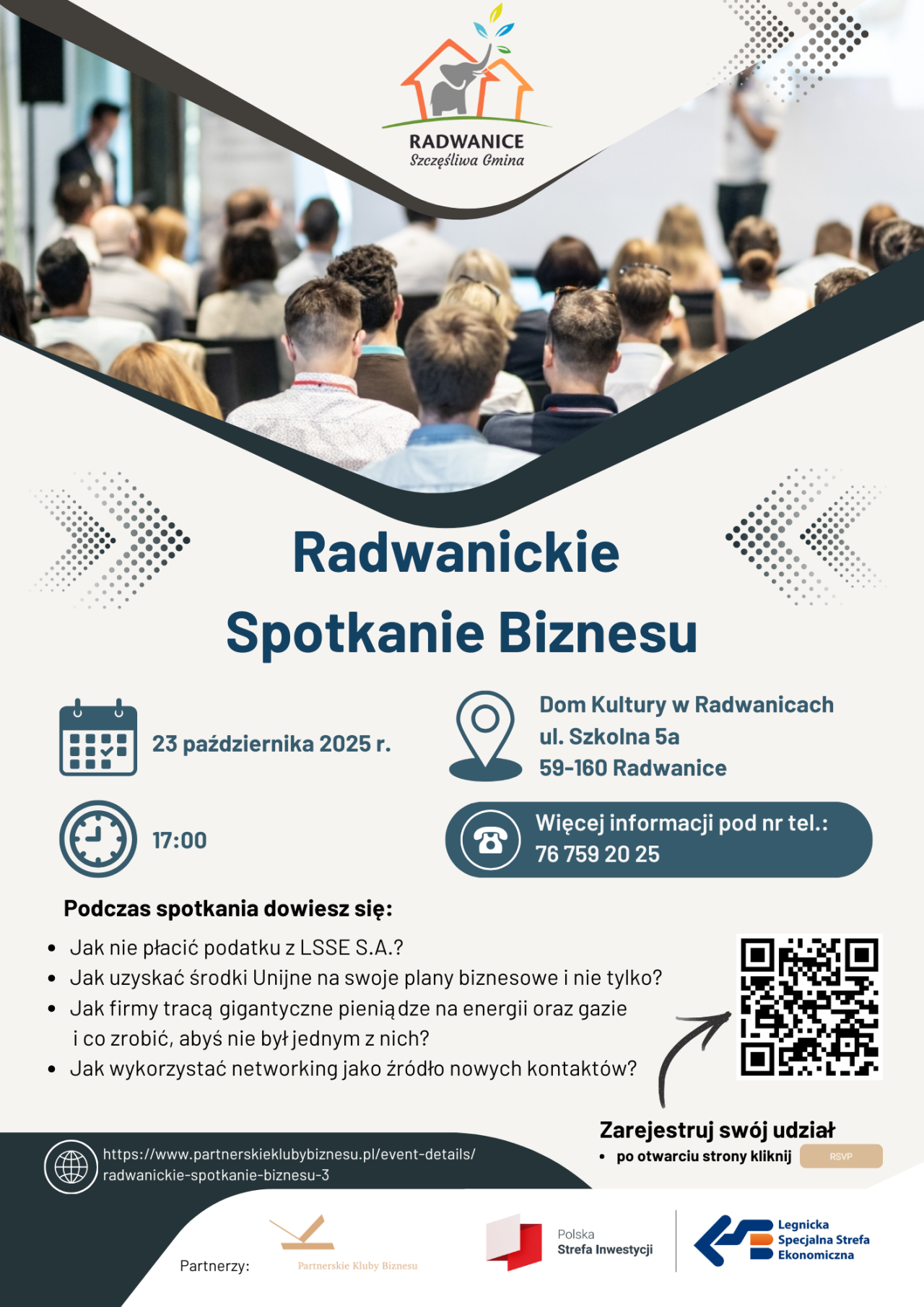 06-10-2025 12:33 Zapraszamy na Radwanickie Spotkanie Biznesu Zapraszamy na Radwanickie Spotkanie Biznesu! To wyjątkowa okazja, by w inspirującym gronie lokalnych przedsiębiorców i liderów wymienić się doświadczeniem, nawiązać nowe kontakty i wspólnie budować silną, prężnie rozwijającą się społeczność biznesową w naszej gminie. Podczas spotkania dowiesz się: Jak nie płacić podatku z LSSE S.A.? Jak uzyskać środki Unijne na swoje plany biznesowe i nie tylko? Jak firmy tracą gigantyczne pieniądze na energii oraz gazie i co zrobić, abyś nie był jednym z nich? Jak wykorzystać networking jako źródło nowych kontaktów? Nie przegap tej szansy – spotkajmy się w Radwanicach i rozwijajmy lokalny biznes razem! 23 października 2025 r. o godz. 17:00 Dom Kultury w Radwanicach ul. Szkolna 5a, 59-160 Radwanice Zarejestruj swój udział: https://www.partnerskieklubybiznesu.pl/event-details/radwanickie-spotkanie-biznesu-3 Wstęp bezpłatny!