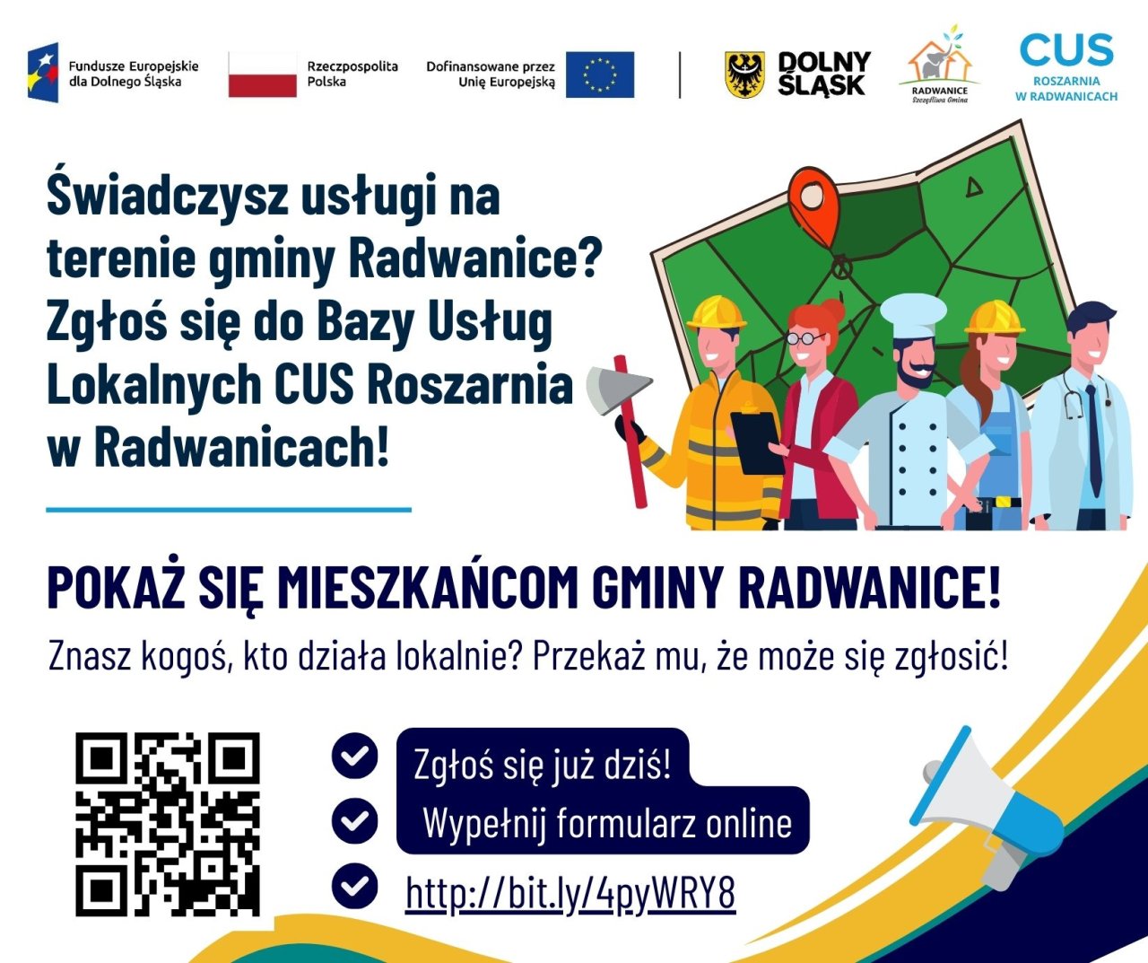 15-10-2025 09:31 PRZEDSIĘBIORCO❗️ Dołącz do Bazy Usług Lokalnych Gminy Radwanice! Dołącz do Bazy Usług Lokalnych gminy Radwanice! Centrum Usług Społecznych Roszarnia w Radwanicach tworzy Bazę Usług Lokalnych i Społecznych, która będzie służyła mieszkańcom naszej gminy jako źródło informacji o dostępnych formach wsparcia, usługach codziennego użytku oraz lokalnych firmach i specjalistach. Naszym celem jest: • ułatwienie mieszkańcom dostępu do potrzebnych usług, • promowanie lokalnych usługodawców, • wspieranie rozwoju gospodarki lokalnej. Kto może się zgłosić? Zapraszamy zarówno podmioty świadczące usługi społeczne, jak i firmy i osoby oferujące powszechnie dostępne usługi, takie jak m.in.: • fizjoterapia, rehabilitacja, • kosmetyka, fryzjerstwo, usługi wellness, • usługi budowlane i remontowe, • wypożyczanie sprzętu (np. rowerów, narzędzi, sprzętu rehabilitacyjnego), • transport lokalny, • ubezpieczenia, tłumaczenia, usługi księgowe, • oraz inne usługi dostępne na terenie Gminy Radwanice. Dlaczego warto? • Twoja firma lub usługa dotrze do większego grona odbiorców. • Zwiększysz swoją widoczność w lokalnej społeczności. • Wesprzesz mieszkańców w znajdowaniu sprawdzonych usług na miejscu. • Zrobisz krok w stronę współpracy z samorządem i lokalnymi instytucjami. Wystarczy wypełnić formularz online: http://bit.ly/4pyWRY8 W razie pytań zapraszamy do kontaktu! 76 831 13 68
