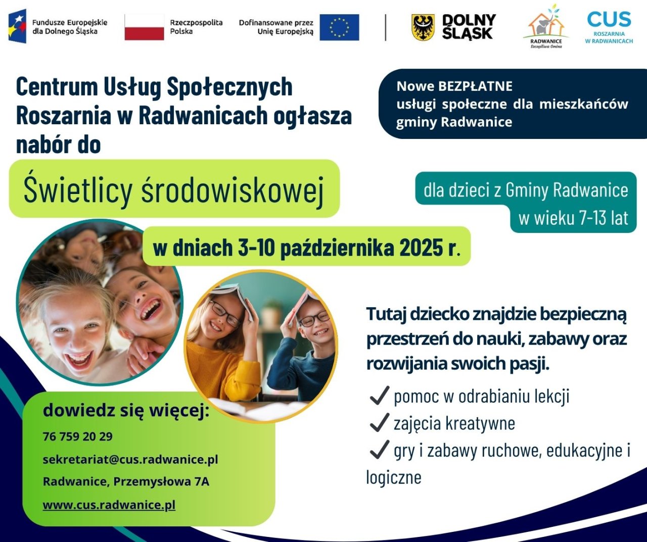 10-10-2025 11:23 Nabór do świetlicy środowiskowej W dniach od 3 do 10 października 2025 Centrum Usług Społecznych rozpoczyna zapisy do świetlicy środowiskowej! To miejsce, gdzie dzieci i młodzież mogą bezpiecznie spędzać czas po szkole, rozwijać swoje pasje i korzystać z pomocy w nauce. Kryteria kwalifikacji: • Do Świetlicy Środowiskowej – przyjmowane są dzieci w wieku 7–13 lat, zamieszkujące na terenie Gminy Radwanice. • Konieczne jest wypełnienie dokumentów rekrutacyjnych dostępnych w CUS Roszarnia w Radwanicach. Kwalifikacja do udziału w zajęciach odbywa się na podstawie: • złożonych wniosków rekrutacyjnych - WNIOSEK O UDZIELENIE USŁUG SPOŁECZNYCH, • decyzji podjętej po analizie wskaźników kwalifikowalności do projektu. Uwaga! • liczba miejsc jest ograniczona, • udział w zajęciach jest bezpłatny. Placówka funkcjonuje tymczasowo w pomieszczeniach Domu Kultury w Radwanicach. Zajęcia odbywają się w czasie roku szkolnego, od poniedziałku do piątku, w godzinach 14:00–18:00. --------------------------------- Projekt finansowany w ramach ,,Tworzenie i rozwój CUS w Radwanicach” współfinansowanego przez Unię Europejską ze środków Europejskiego Funduszu Społecznego Plus w ramach Programu Fundusze Europejskie dla Dolnego Śląska 2021-2027, Priorytet nr 7 ,,Fundusze Europejskie na rzecz rynku pracy i włączenia społecznego na Dolnym Śląsku”, Działania nr 7.7 „Rozwój usług społecznych i zdrowotnych”.