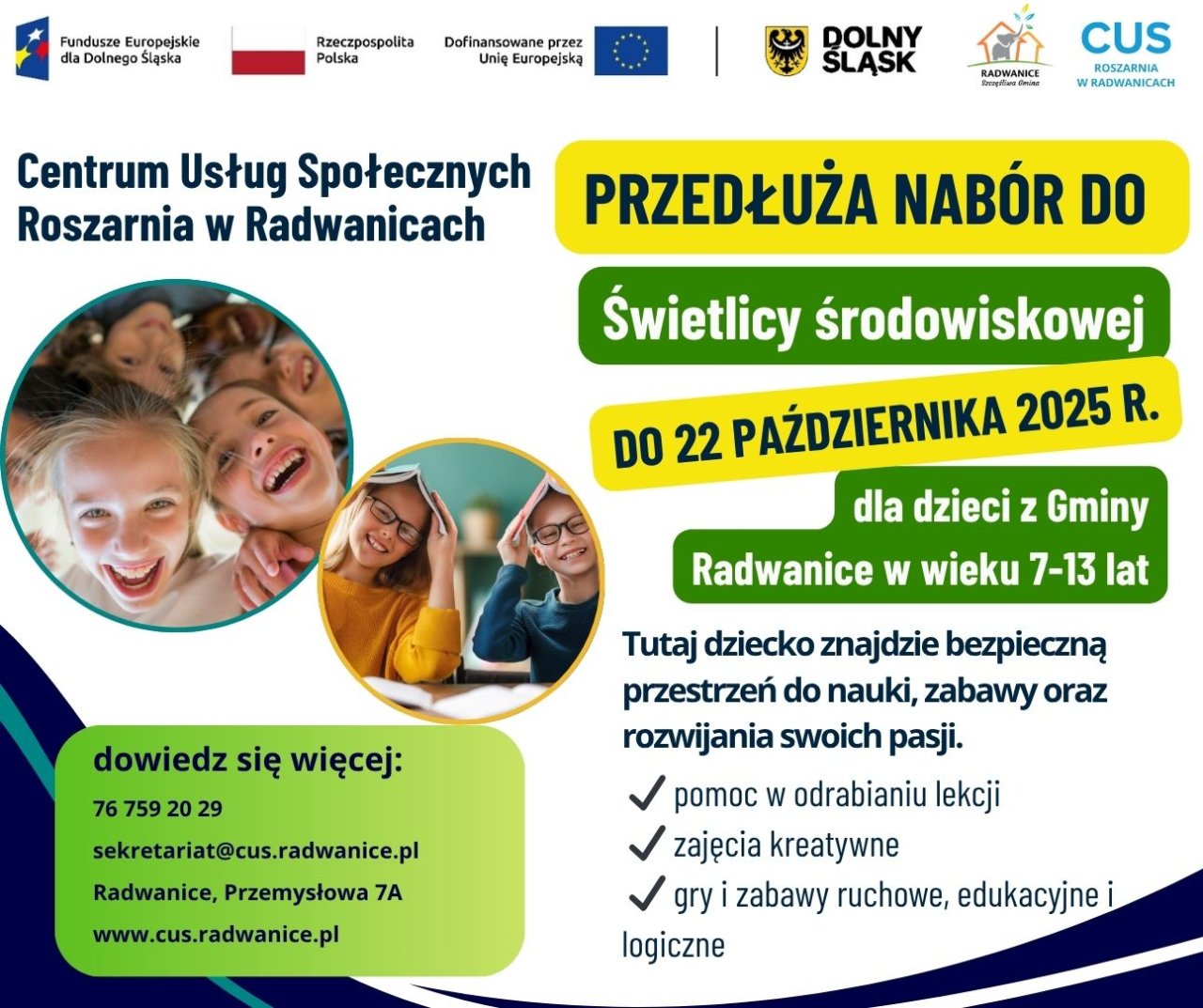 10-10-2025 11:23 Nabór do świetlicy środowiskowej Centrum Usług Społecznych rozpoczyna zapisy do świetlicy środowiskowej! To miejsce, gdzie dzieci i młodzież mogą bezpiecznie spędzać czas po szkole, rozwijać swoje pasje i korzystać z pomocy w nauce. Kryteria kwalifikacji: • Do Świetlicy Środowiskowej – przyjmowane są dzieci w wieku 7–13 lat, zamieszkujące na terenie Gminy Radwanice. • Konieczne jest wypełnienie dokumentów rekrutacyjnych dostępnych w CUS Roszarnia w Radwanicach. Kwalifikacja do udziału w zajęciach odbywa się na podstawie: • złożonych wniosków rekrutacyjnych - WNIOSEK O UDZIELENIE USŁUG SPOŁECZNYCH, • decyzji podjętej po analizie wskaźników kwalifikowalności do projektu. Uwaga! • liczba miejsc jest ograniczona, • udział w zajęciach jest bezpłatny. Placówka funkcjonuje tymczasowo w pomieszczeniach Domu Kultury w Radwanicach. Zajęcia odbywają się w czasie roku szkolnego, od poniedziałku do piątku, w godzinach 14:00–18:00. --------------------------------- Projekt finansowany w ramach ,,Tworzenie i rozwój CUS w Radwanicach” współfinansowanego przez Unię Europejską ze środków Europejskiego Funduszu Społecznego Plus w ramach Programu Fundusze Europejskie dla Dolnego Śląska 2021-2027, Priorytet nr 7 ,,Fundusze Europejskie na rzecz rynku pracy i włączenia społecznego na Dolnym Śląsku”, Działania nr 7.7 „Rozwój usług społecznych i zdrowotnych”.