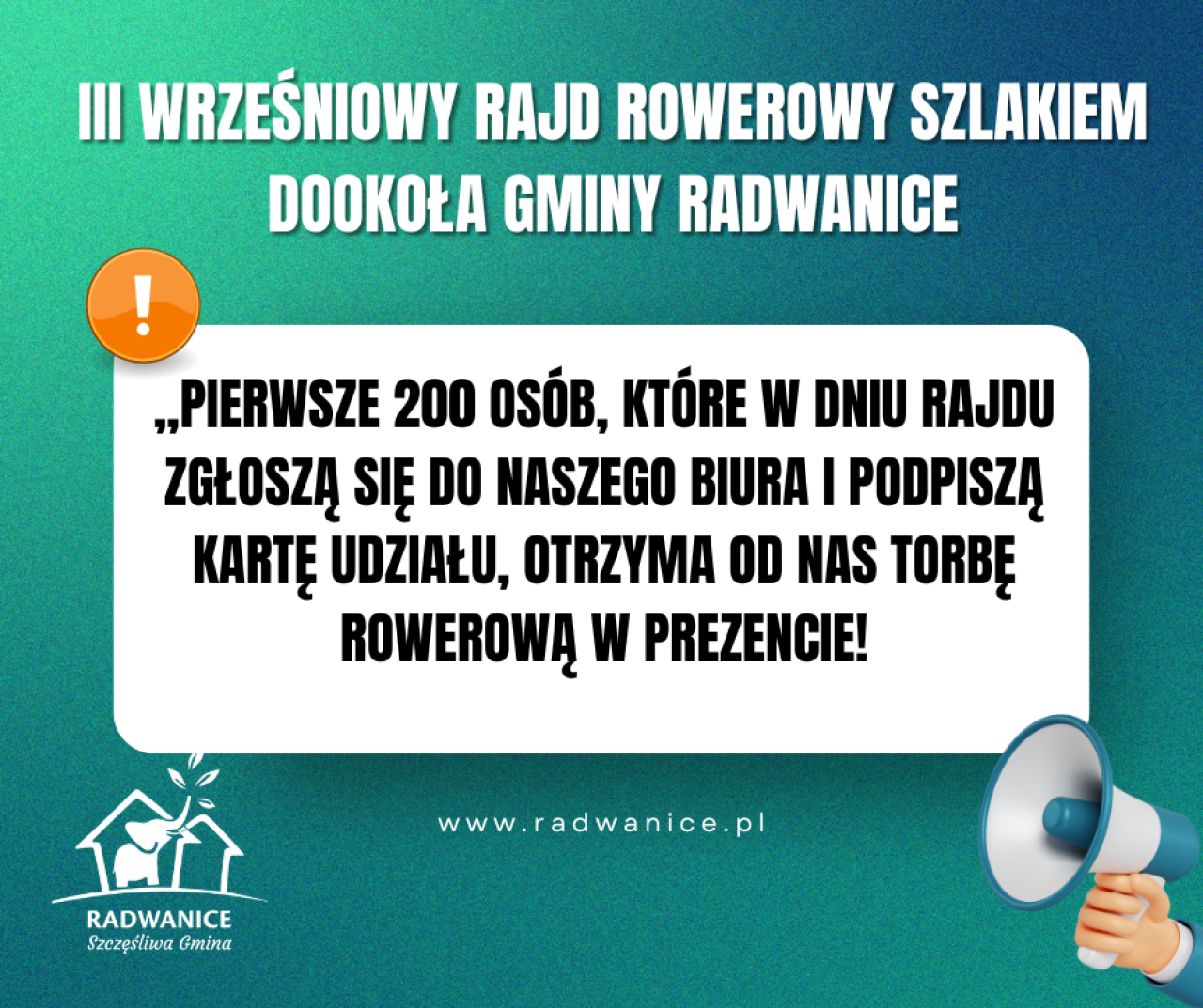 10-09-2025 11:37 III Wrześniowy Rajd Rowerowy Szlakiem Dookoła Gminy Radwanice – ruszamy już 13 września! III Wrześniowy Rajd Rowerowy Szlakiem Dookoła Gminy Radwanice – ruszamy już 13 września! Miłośnicy dwóch kółek – czas odkurzyć rowery, przygotować kaski i… w drogę! Gmina Radwanice zaprasza na III Wrześniowy Rajd Rowerowy Szlakiem Dookoła Gminy Radwanice, który odbędzie się 13 września. To wyjątkowa okazja, by wspólnie pokonać 50 kilometrów malowniczej, zróżnicowanej trasy, ciesząc się pięknem lokalnej przyrody, sportową atmosferą i integracją z innymi pasjonatami aktywnego stylu życia. Start i meta – serce wydarzenia w Parku w Radwanicach Uczestnicy wystartują z Parku w Radwanicach, który tego dnia zamieni się w tętniące życiem centrum rowerowego święta. Trasa została poprowadzona tak, aby każdy – zarówno amator, jak i bardziej zaawansowany rowerzysta – mógł czerpać przyjemność z jazdy i jednocześnie podziwiać urokliwe zakątki naszej gminy. – To nie tylko rajd, to sposób na wspólne przeżywanie sportowej pasji, odkrywanie naszej pięknej okolicy i budowanie więzi sąsiedzkich! 🎁 Nagrody, atrakcje i rowerowe emocje Na mecie na uczestników czeka pyszny poczęstunek, a także emocjonujące konkursy z nagrodami. W tym roku stawka jest wysoka – do wygrania aż 3 rowery MTB oraz praktyczne akcesoria rowerowe, które z pewnością przydadzą się każdemu miłośnikowi dwóch kółek! 📝 Jak się zapisać? Udział w rajdzie jest otwarty dla wszystkich chętnych – zarówno mieszkańców gminy, jak i gości z innych regionów. Zapisy są już otwarte! Można zgłosić się poprzez formularz internetowy dostępny na stronie https://forms.gle/GAzPwuAx3LhENGvBA lub osobiście w Urzędzie Gminy Radwanice. 📞 Dodatkowe informacje można uzyskać pod numerem telefonu: 76 759 20 19. 🚴 Nie czekaj – dołącz do rowerowego święta Gminy Radwanice! III Wrześniowy Rajd Rowerowy to doskonała okazja, by aktywnie spędzić czas, zadbać o zdrowie i wziąć udział w niezapomnianym wydarzeniu sportowym. Ubierz kask, złap za kierownicę i… widzimy się 13 września w Radwanicach! Do zobaczenia na trasie! FORMULARZ INTERENTOWY MAPKA Drodzy Państwo, Przypominamy, że udział w rajdzie rowerowym wymaga podpisania pisemnej zgody w biurze organizatora. ➡️ Biuro będzie czynne w sobotę w godzinach 09:00–10:40. ➡️ O godz. 10:40 rozpoczynamy odprawę. ➡️ Start rajdu nastąpi o godz. 11:00. Dodatkowo, pierwsze 200 osób, które dopełnią formalności w biurze, otrzyma od nas torbę rowerową w prezencie 🎁🚴. Do zobaczenia na starcie!