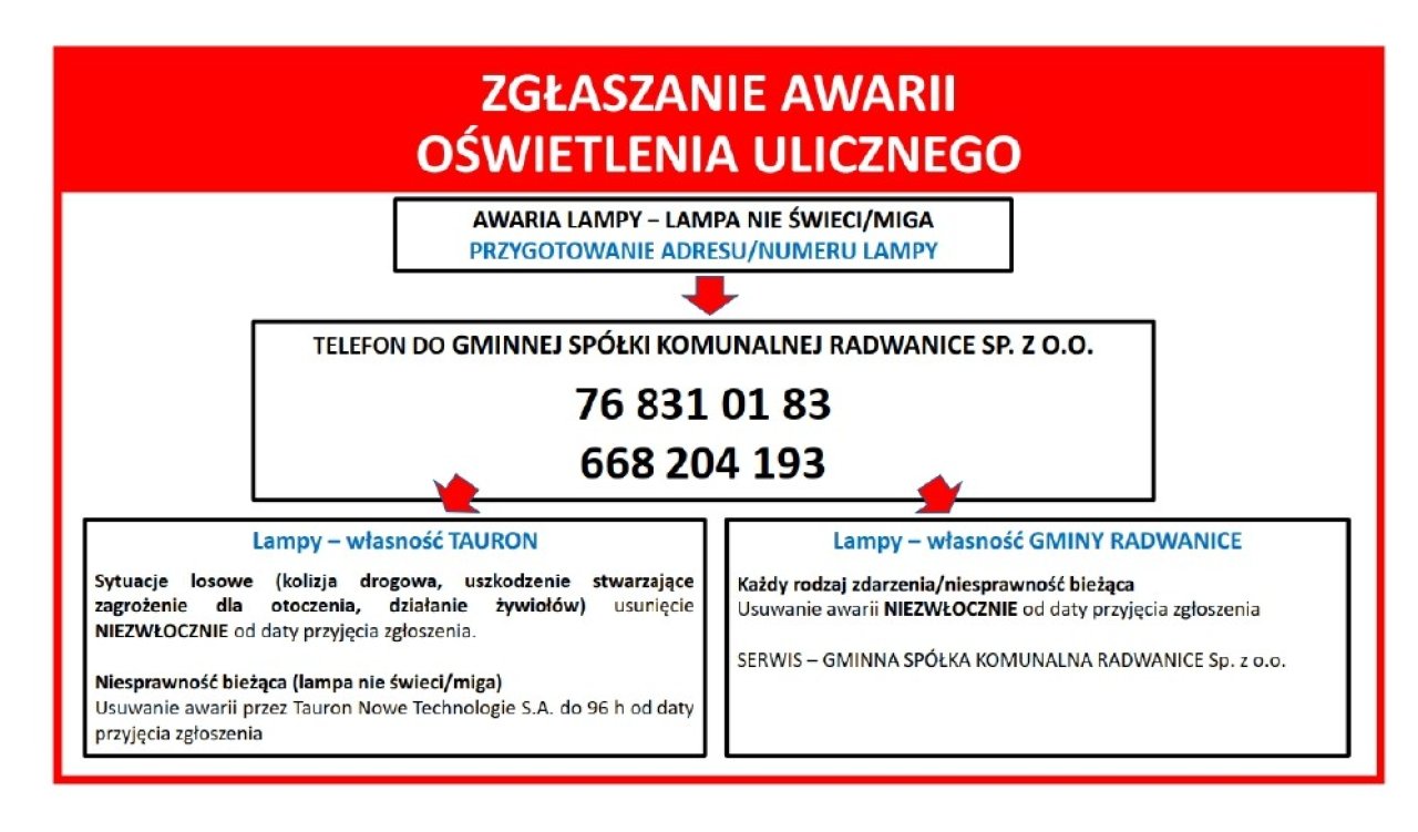 09-02-2026 08:45 Zgłaszanie awarii oświetlenia ulicznego Zgłoszenia awarii oświetlenia ulicznego przyjmowane są przez Gminną Spółkę Komunalną Radwanice Sp. z o.o. pod numerami telefonu 76 831 01 83, 668 204 193 WAŻNE! Dokonując zgłoszenia należy podać: • miejscowość, w której wystąpiła awaria, • numer słupa, na którym umieszczony jest punkt świetlny, bądź w przypadku jego braku, dane najbliższego punktu adresowego, • co dzieje się z oświetleniem - lampa nie świeci/miga.
